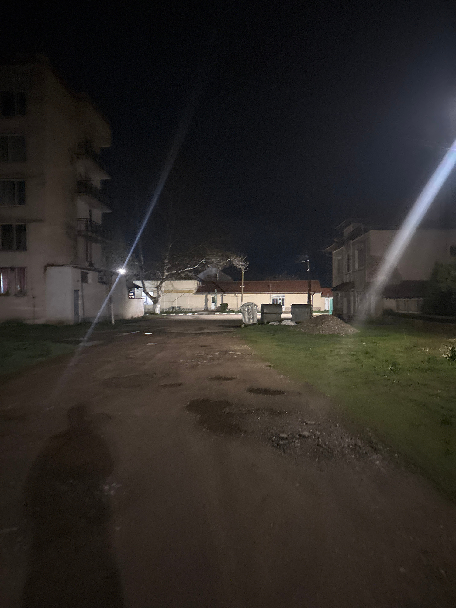 The image depicts a nighttime scene in Lehchevo, Bulgaria. A narrow alleyway is visible, flanked by buildings on both sides. The left side features a light-colored multi-story building with visible wi…read more