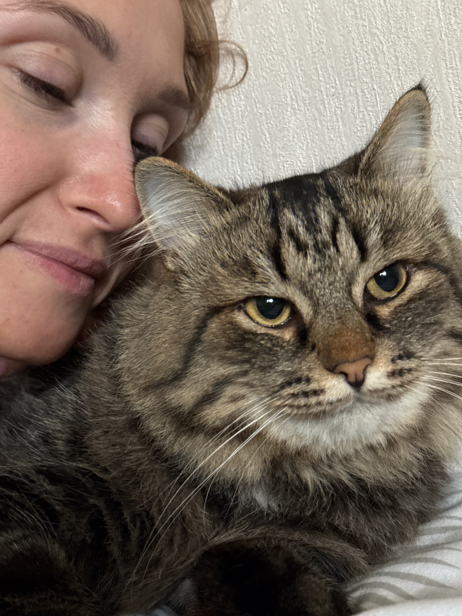 A close-up image shows a woman lying down with a brown tabby cat on top of her. The woman's face is partially visible; her eyes are closed, and her cheek and lips are visible. The cat's face is promin…read more