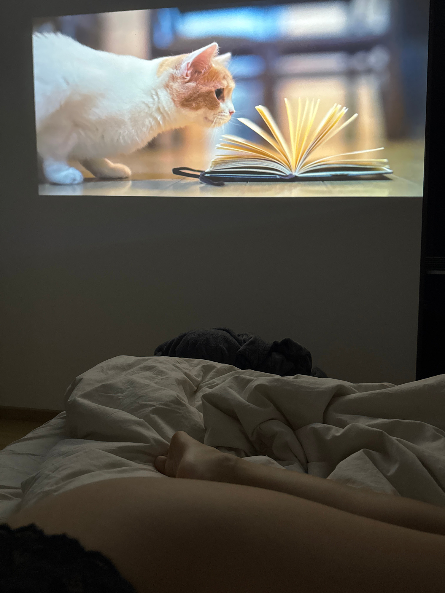 The image shows a projection on a wall of a photograph depicting a white and orange cat looking up at an open book with its pages fanned out. To the right of the projection, on what appears to be a be…read more