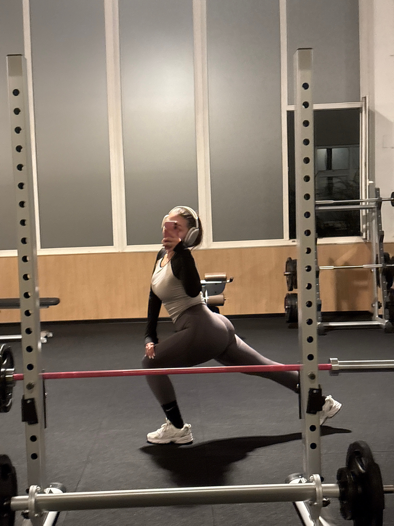 A woman in athletic wear and headphones is stretching in a gym setting. The gym appears to contain weightlifting equipment including a squat rack and weights. The location is Mönchengladbach, Germany.