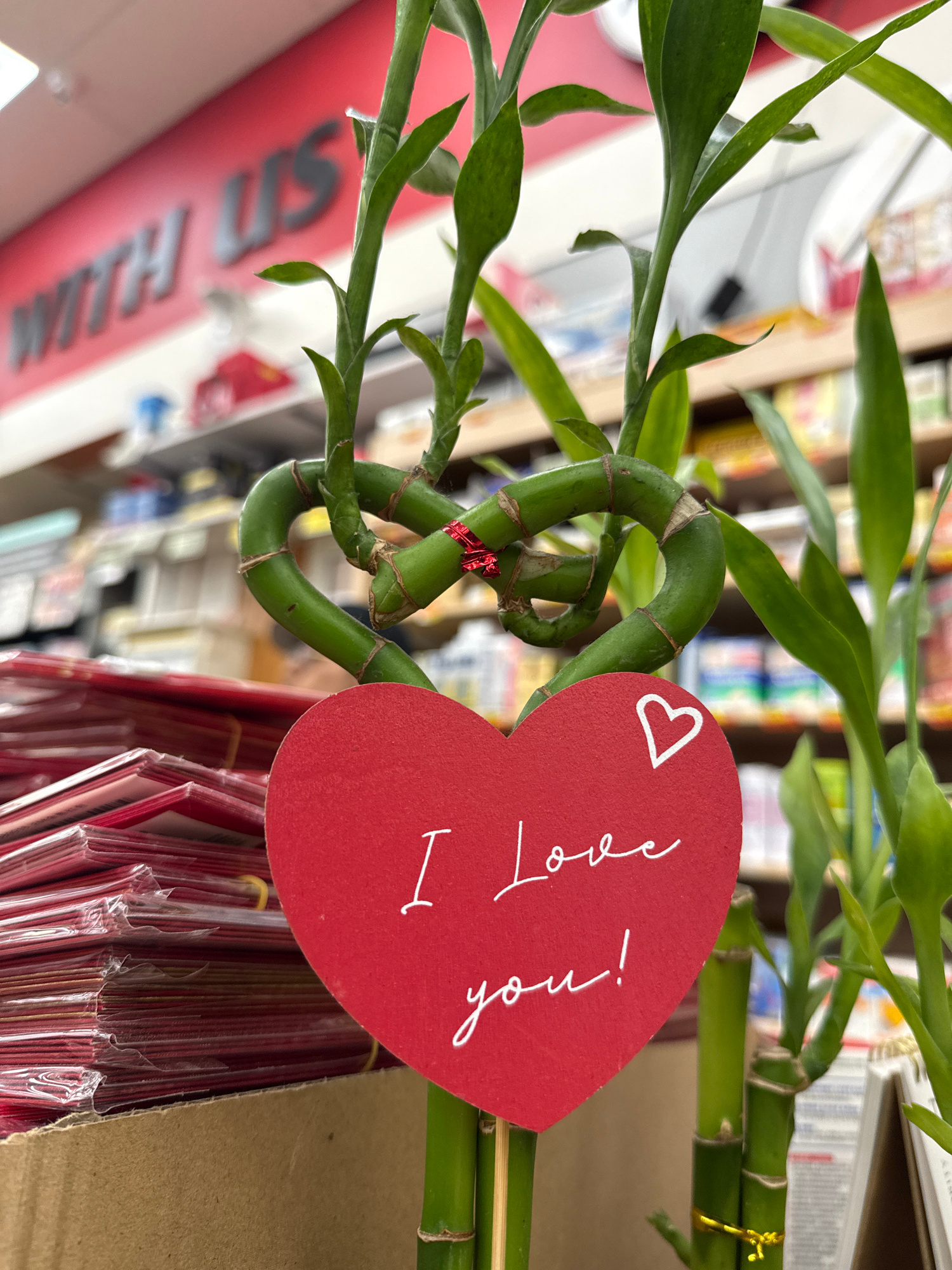 A photograph taken indoors in Davie, Florida, United States of America, shows a bamboo plant with a red heart-shaped tag that reads "I love you!" The plant's stems are green and twisted into a decorat…read more