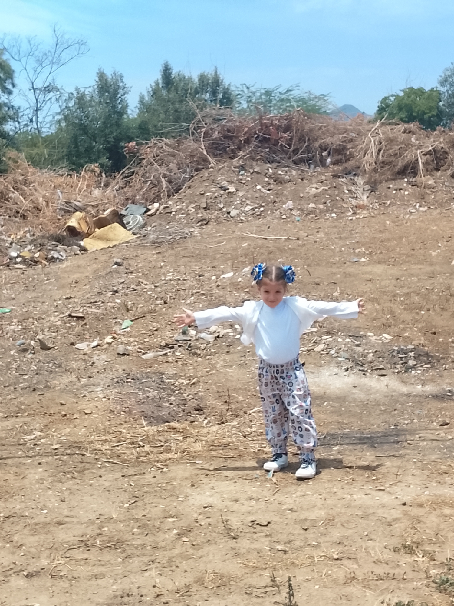 A young girl stands with arms outstretched in a barren landscape, possibly in Altagracia, Venezuela. She wears a light blue long-sleeved shirt, a white cardigan, patterned pants, and white sneakers. H…read more