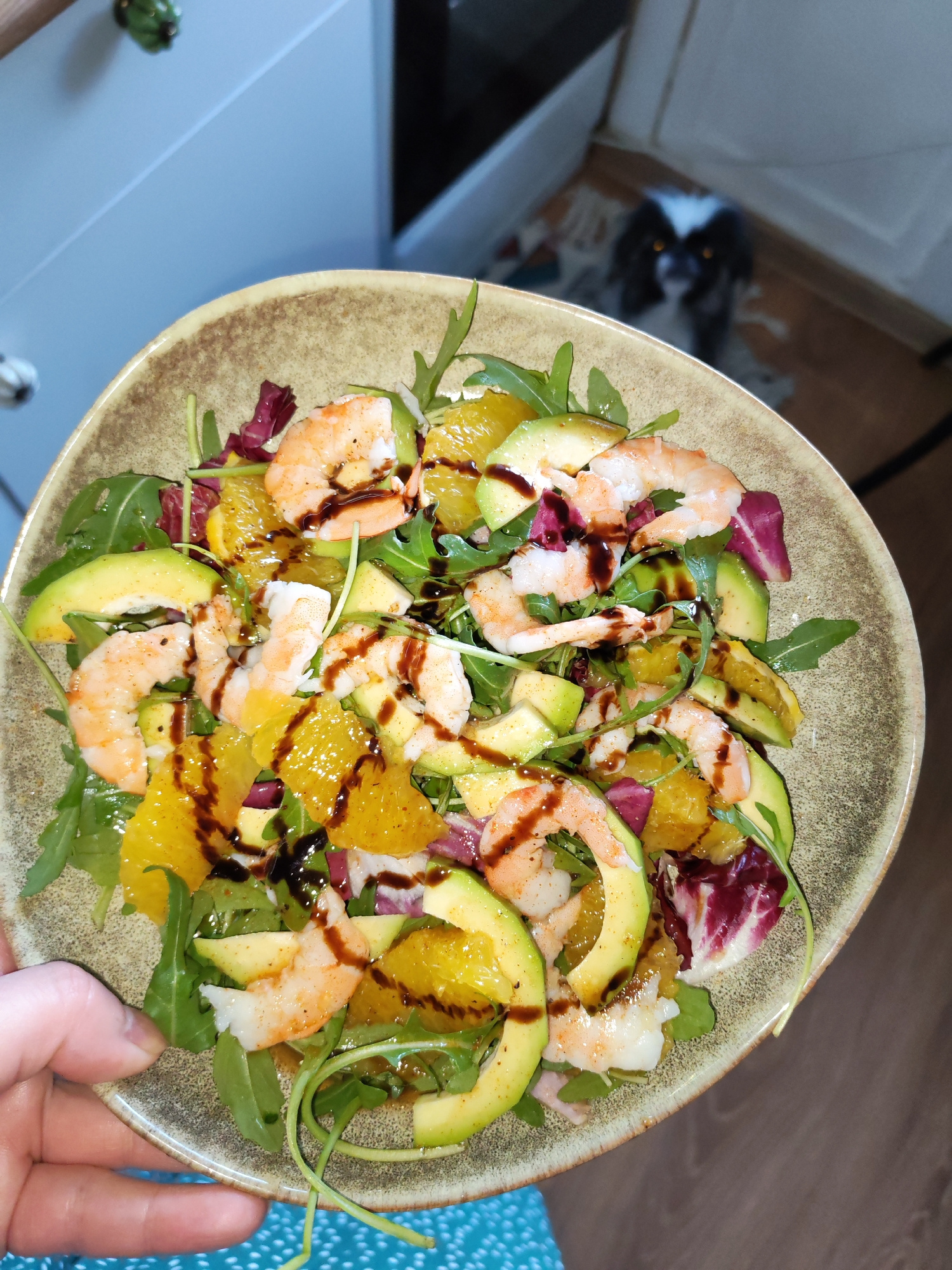 An indoor, overhead shot captures a vibrant salad held in a person's hand, positioned centrally in the frame. The main subject is a round, earthy-toned bowl filled with a fresh mix of ingredients. Pro…read more
