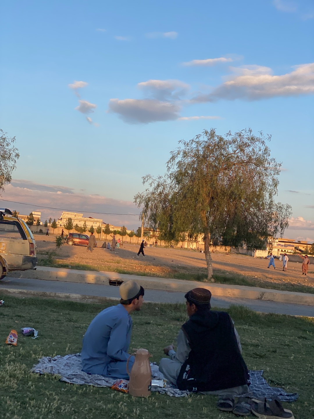 Two men are seated on a blanket spread on a grassy area. One is wearing a light blue shalwar kameez and a light-colored cap, while the other wears a dark vest over a gray shalwar kameez and a dark-colโฆread more