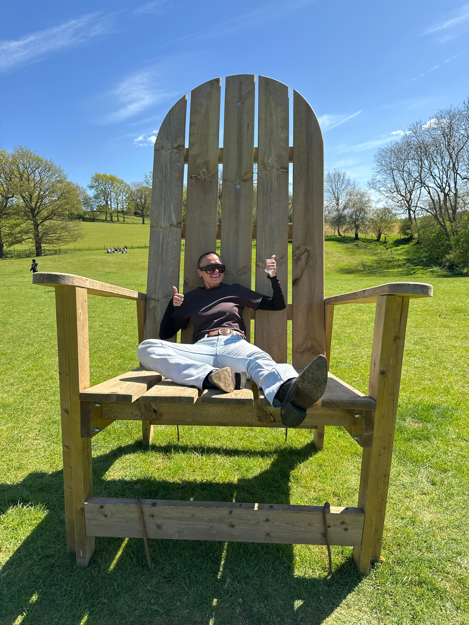 A medium shot, taken outdoors, features a woman lounging on an oversized wooden Adirondack chair set amidst a lush green lawn, against a backdrop of trees and a clear blue sky with wispy clouds, sugge…read more