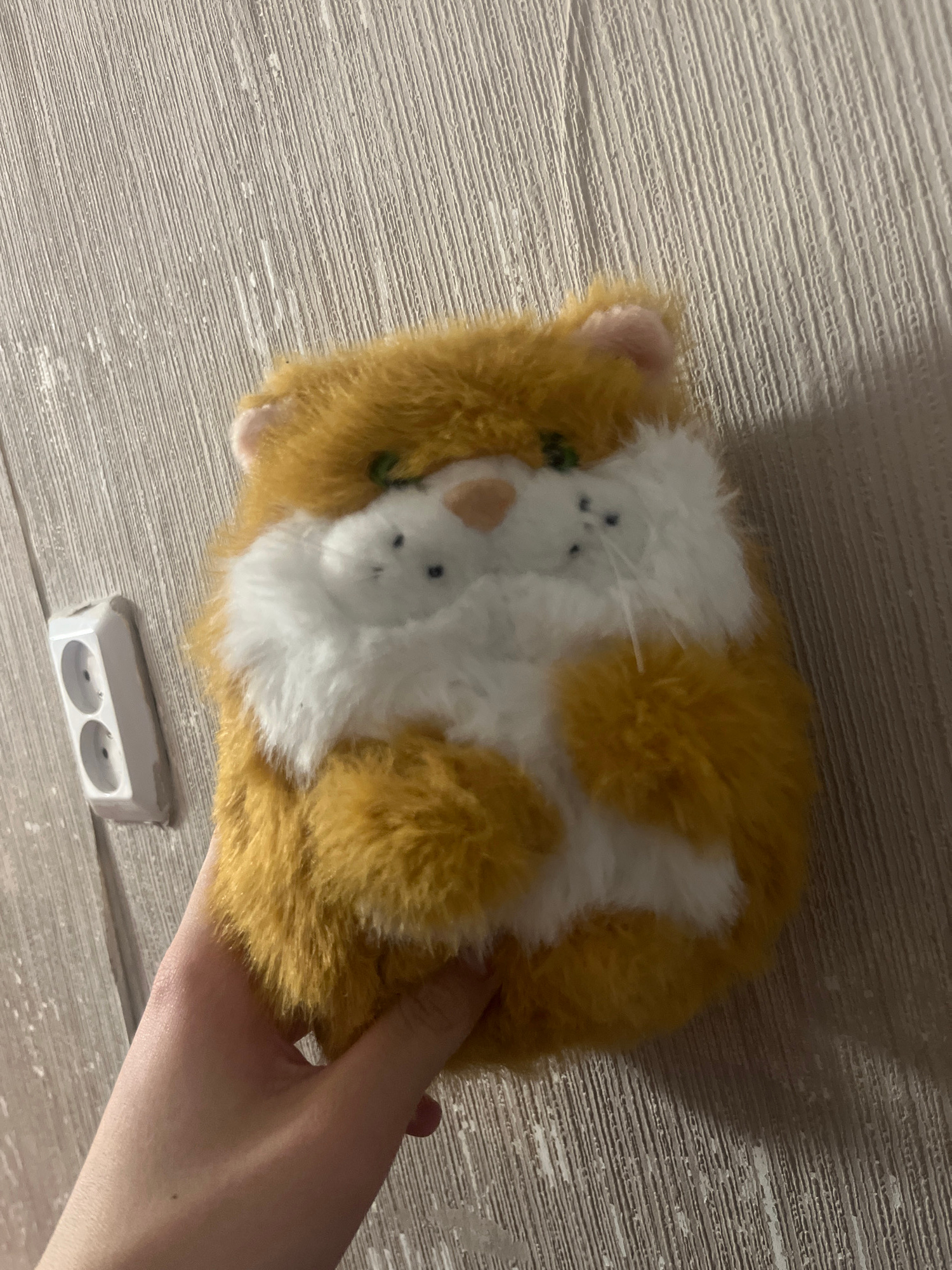 A tan and white plush toy resembling a guinea pig lies on a textured gray surface, with a hand partially visible to the right, holding the toy. A white electrical outlet with two sockets is positioned…read more