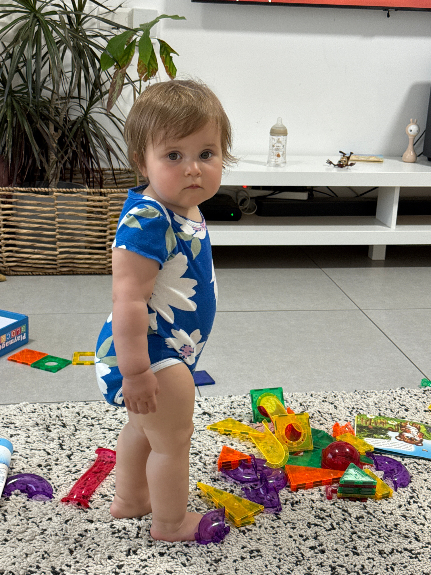 The image, oriented correctly, captures a young child, likely a toddler, standing upright indoors and looking directly at the camera with a neutral and curious expression. The child has light brown ha…read more