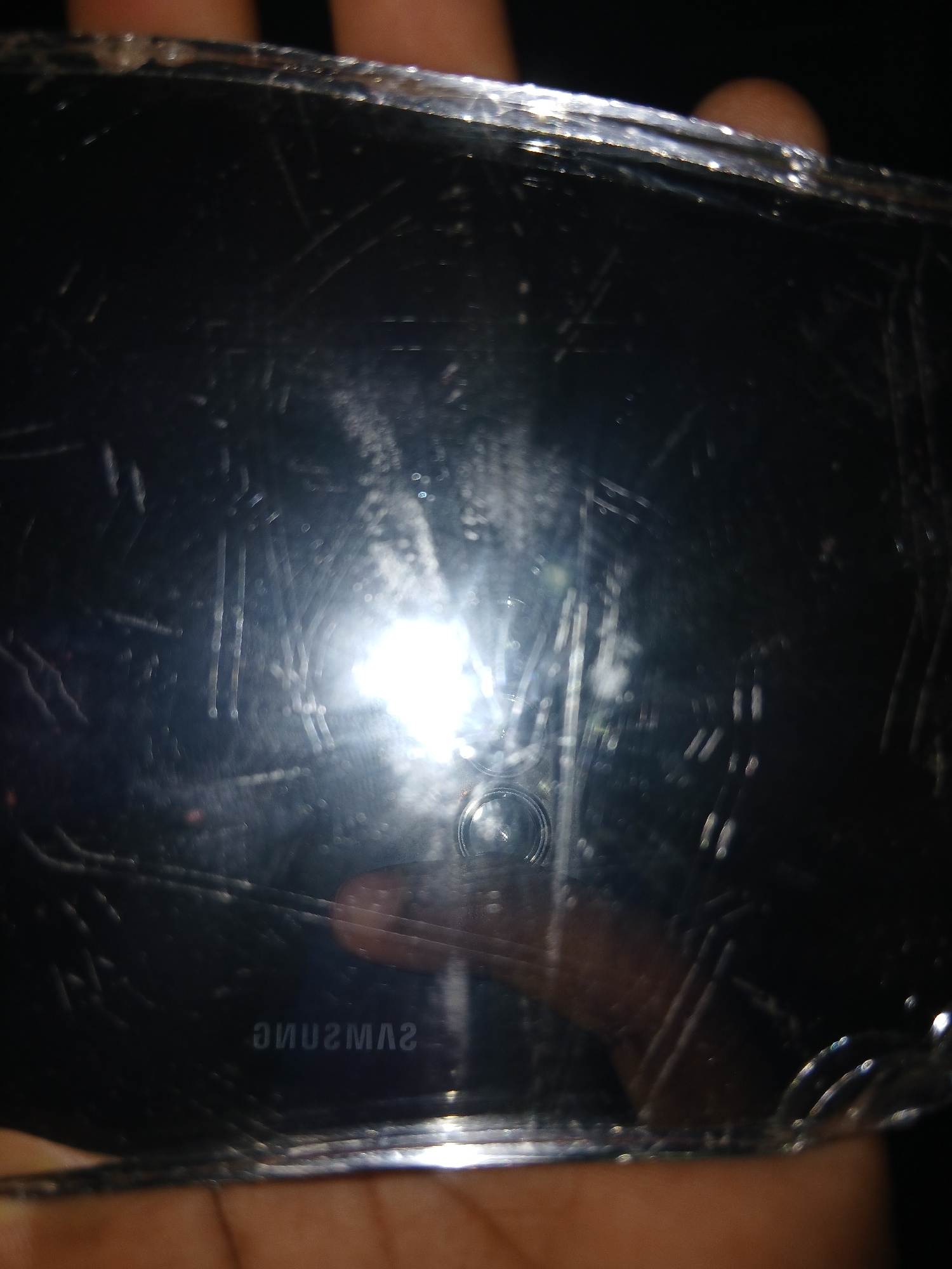 The image features a close-up view of a heavily scratched Samsung smartphone, held by a person. The phone's screen is black, indicating it is powered off or in standby. A bright, intense glare from a…read more