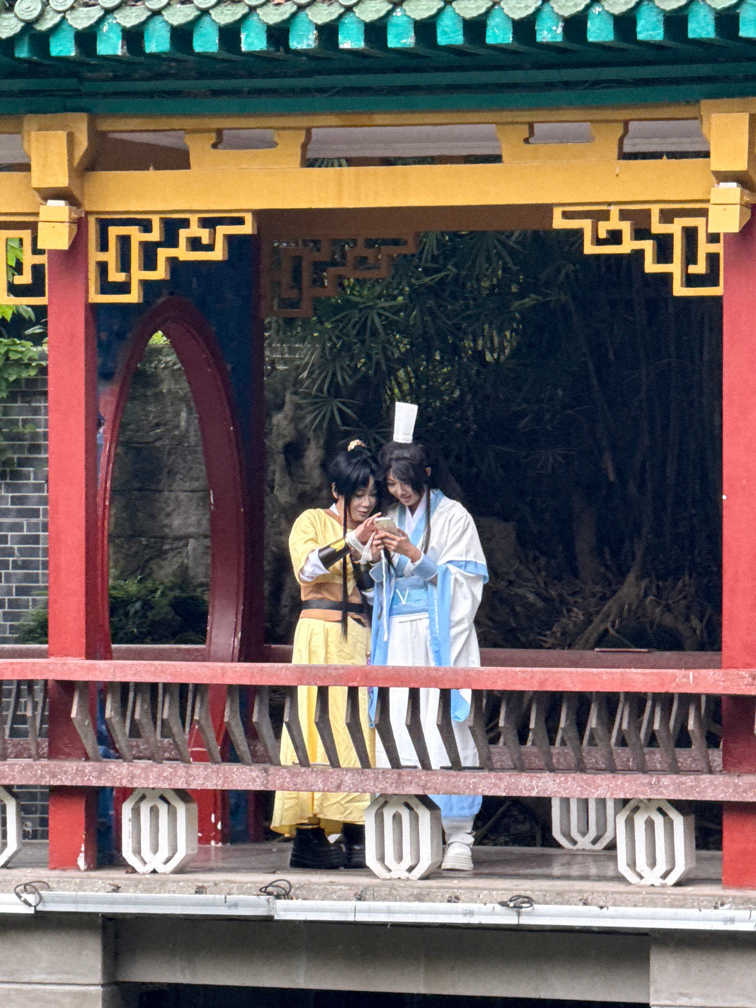 Two people, one in yellow and one in white and blue traditional Chinese clothing, are positioned in front of a red and yellow ornate archway structure. The red structure has a decorative oval opening…read more