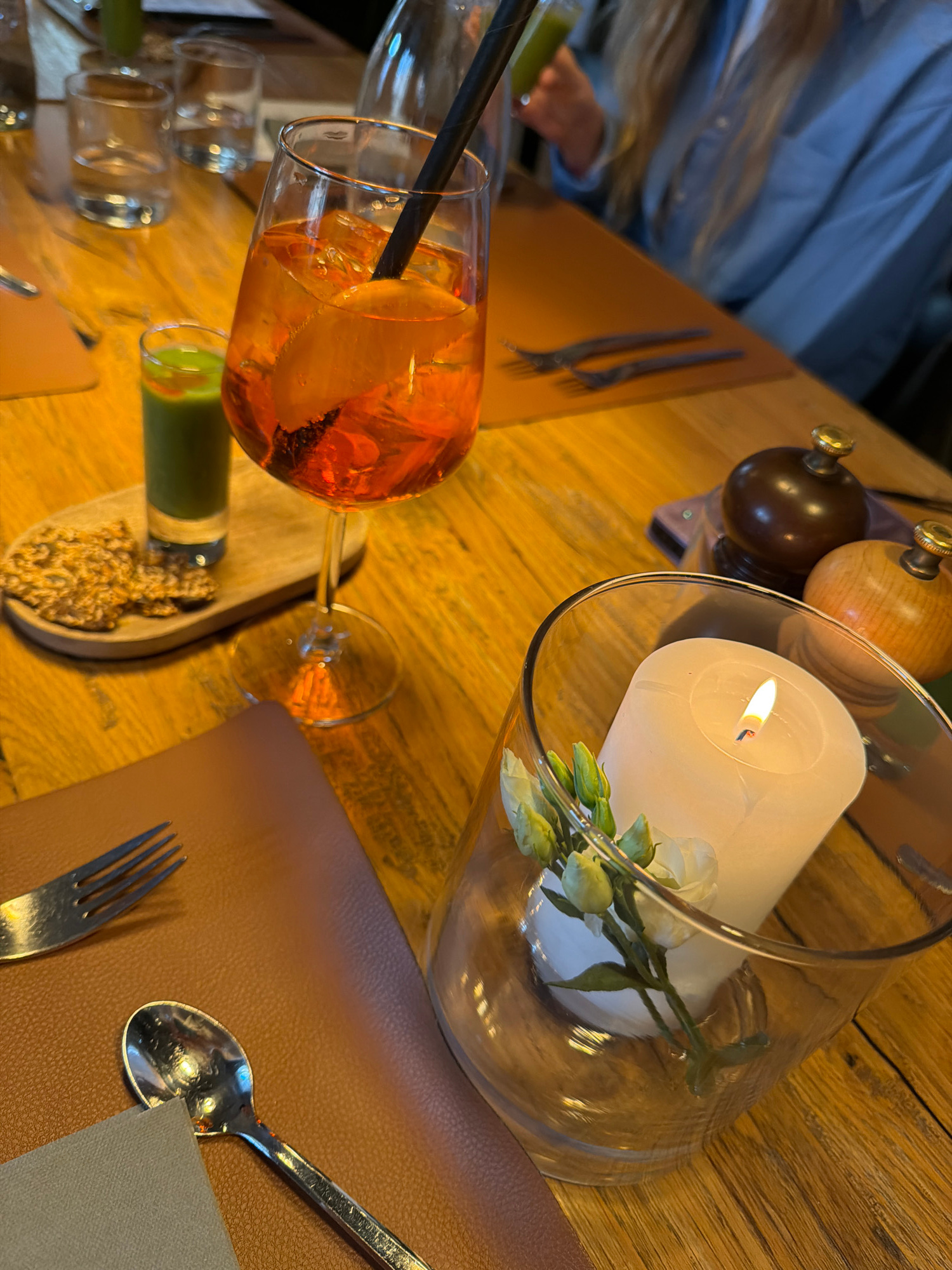 The image depicts a table setting in Ljubljana, Slovenia. On a wooden table are place settings with brown placemats, silverware (a fork and a spoon), and gray napkins. A lit white candle in a glass va…read more