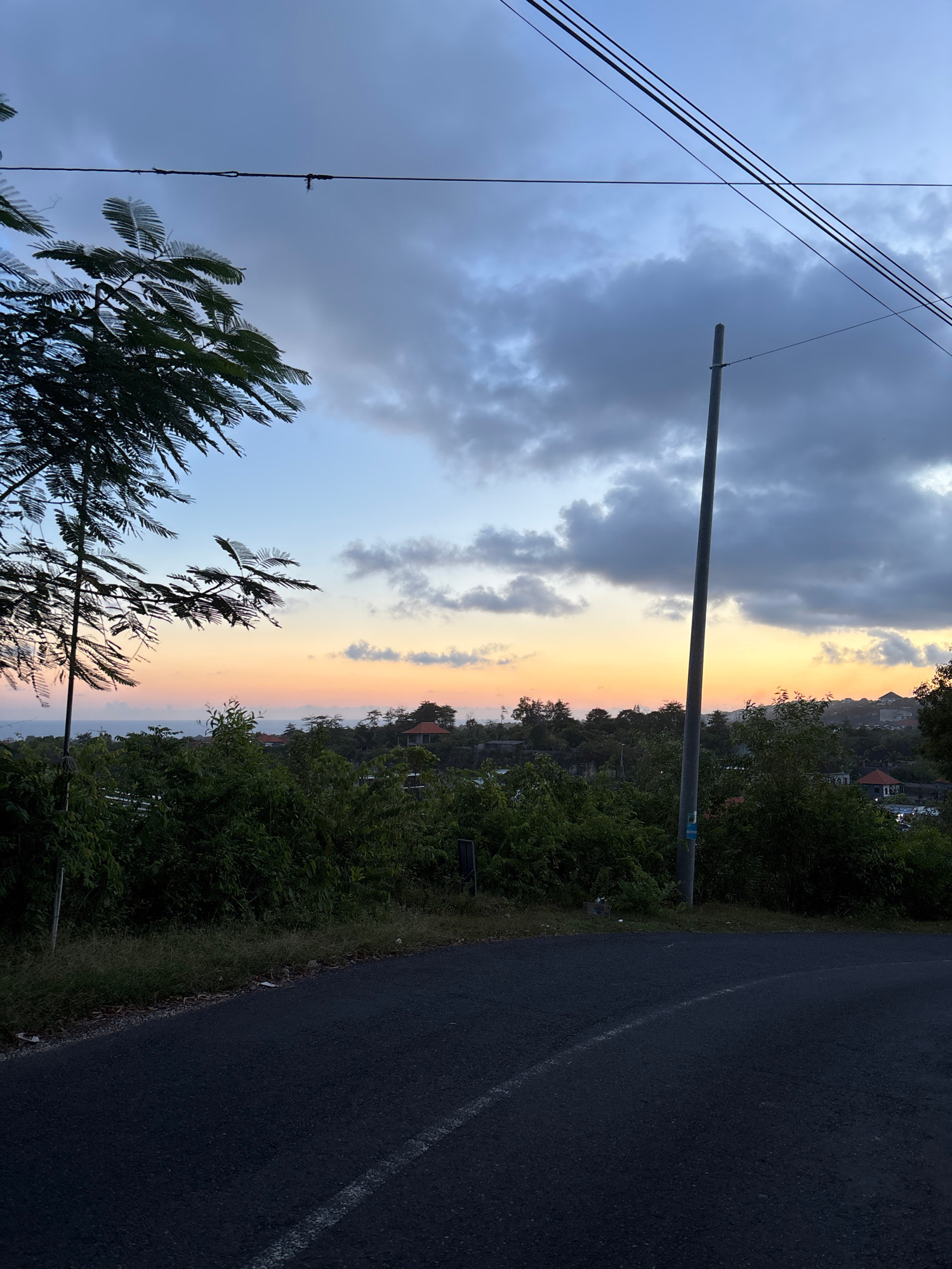 The image presents a view along a road, possibly within the Ungasan area of Indonesia, as suggested by the landscape and vegetation. The frame is oriented vertically with the road curving on the right…read more