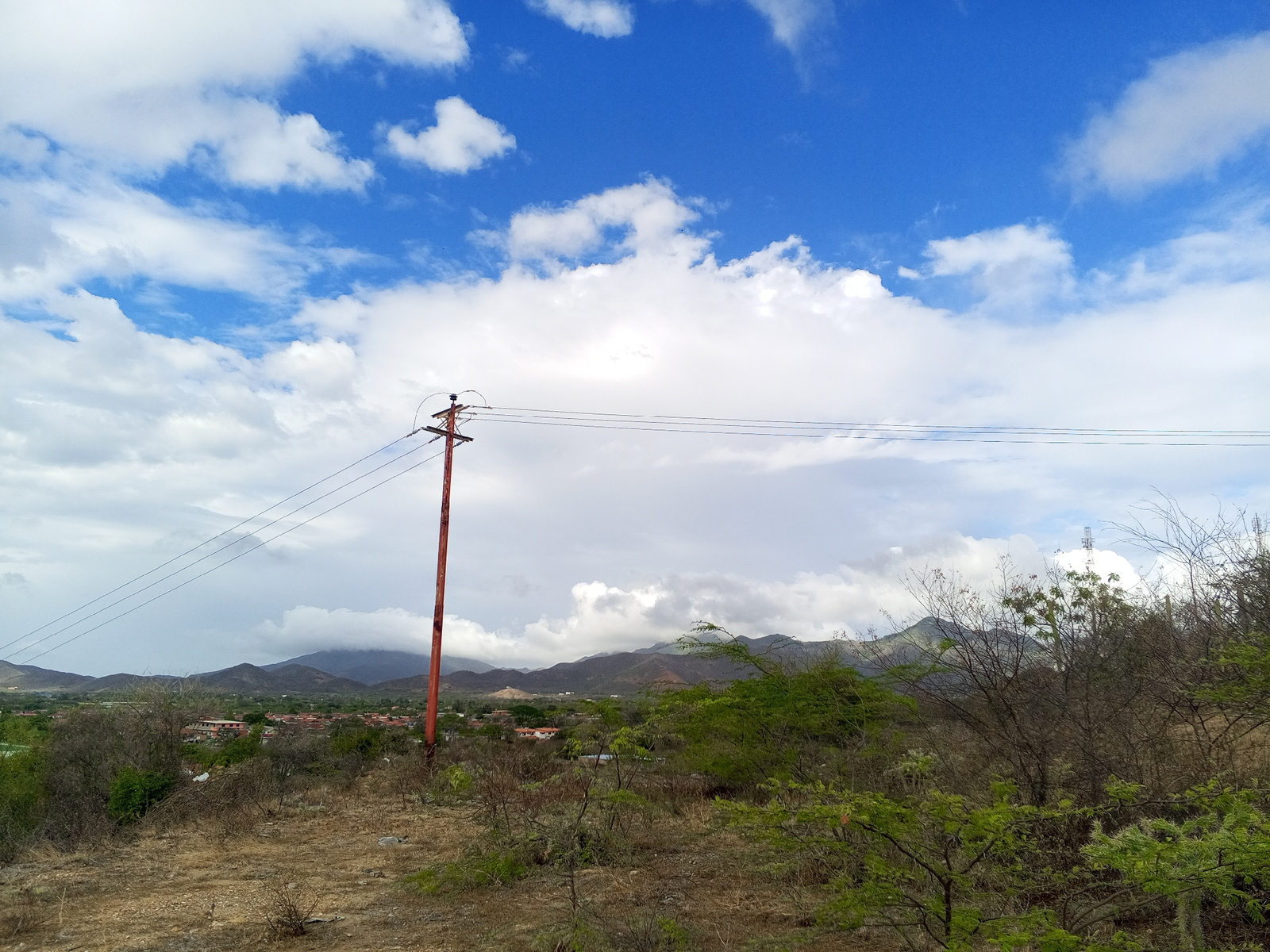 The image depicts a landscape near Juan Griego, Venezuela. The foreground is characterized by dry, scrubby vegetation on a brown, dirt-covered ground. A utility pole stands prominently in the midgroun…read more
