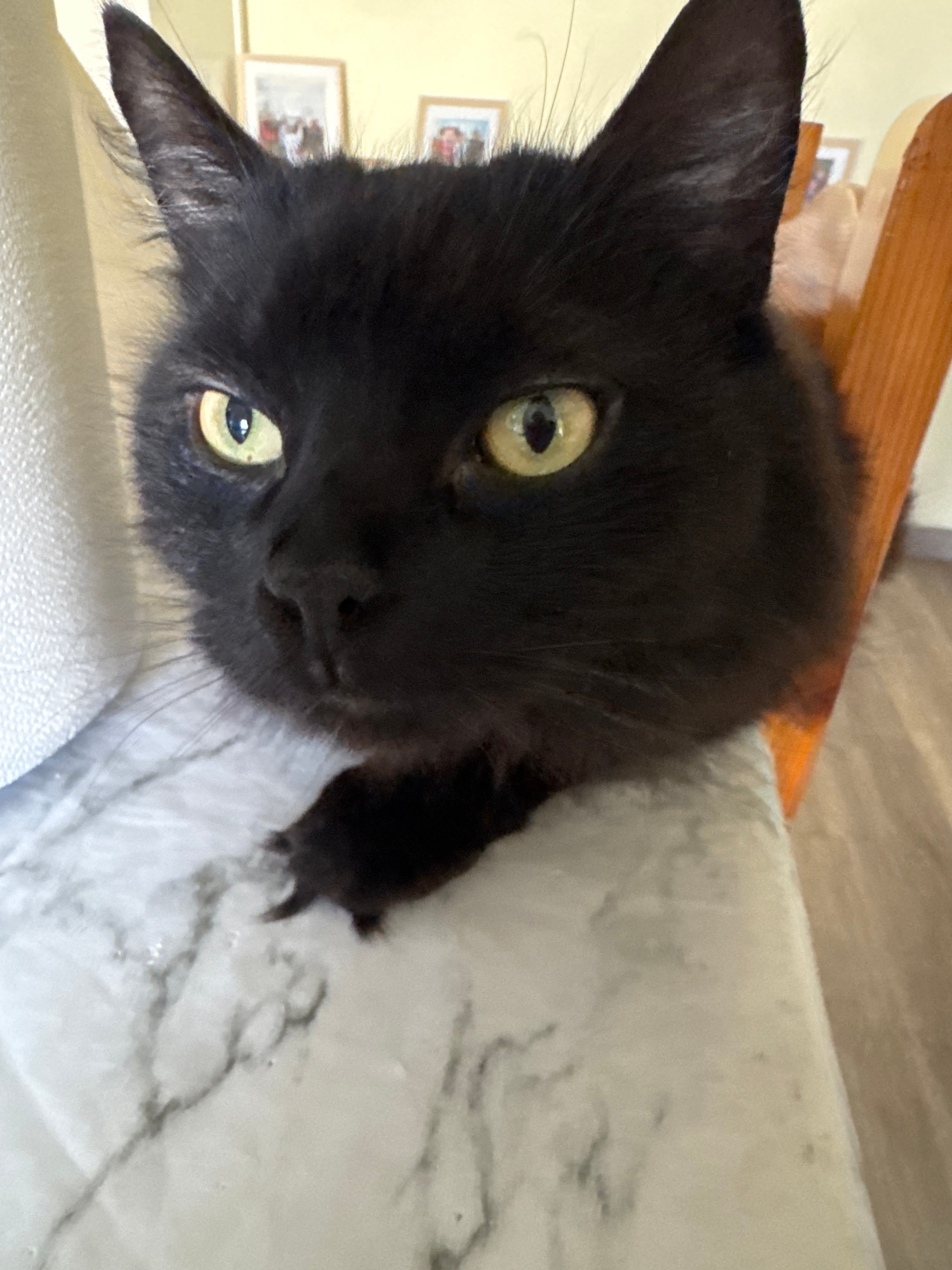 The image primarily features a black cat, its head being the central subject. The cat has striking, large green-yellow eyes with dark, slit pupils, giving it an alert and curious expression. Its fur iā¦read more