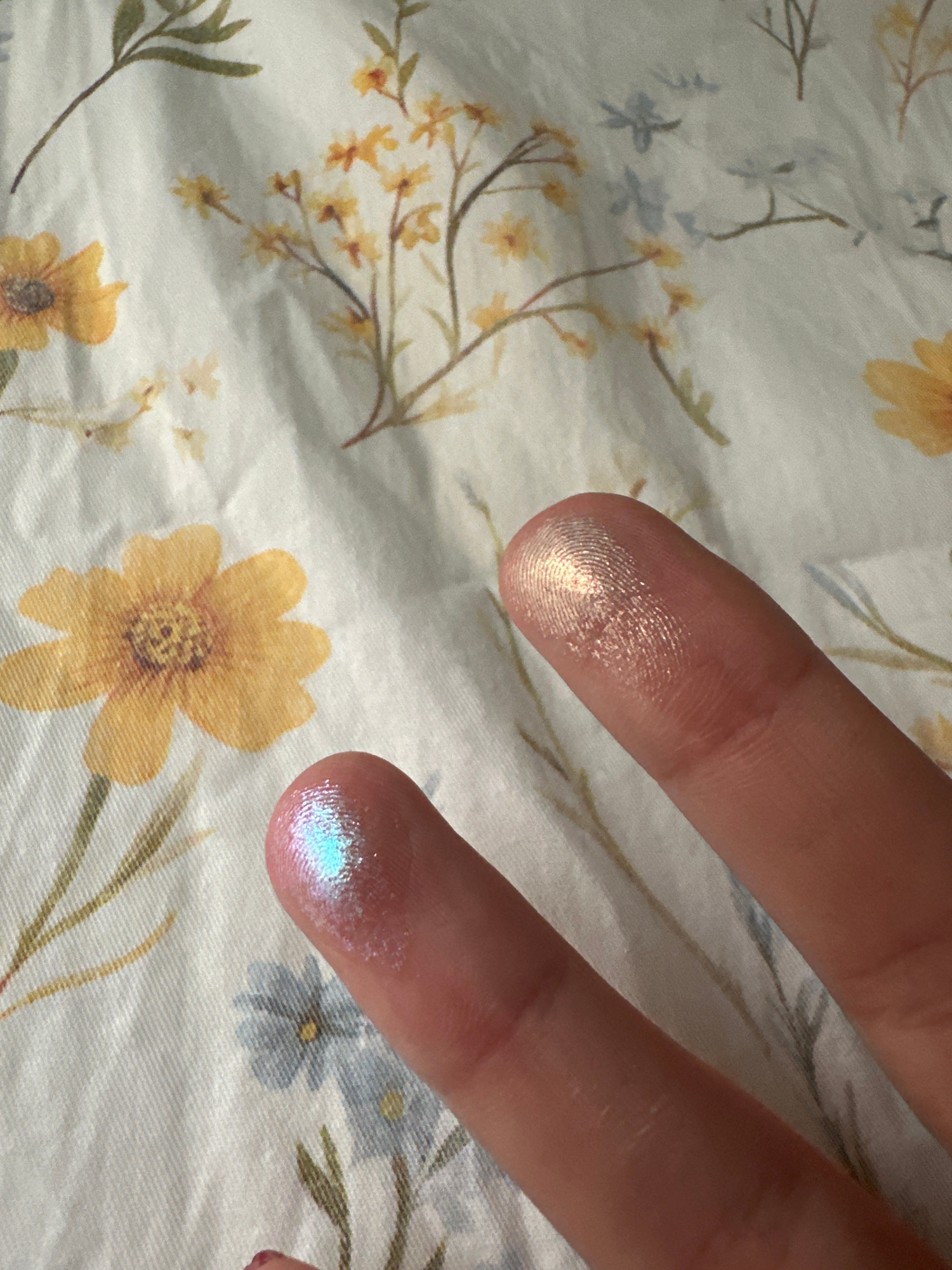 The image shows two fingers with shimmery cosmetic product on the fingertips. One fingertip has a gold-toned shimmer, while the other has a light blue shimmer. The background is a floral patterned fab…read more