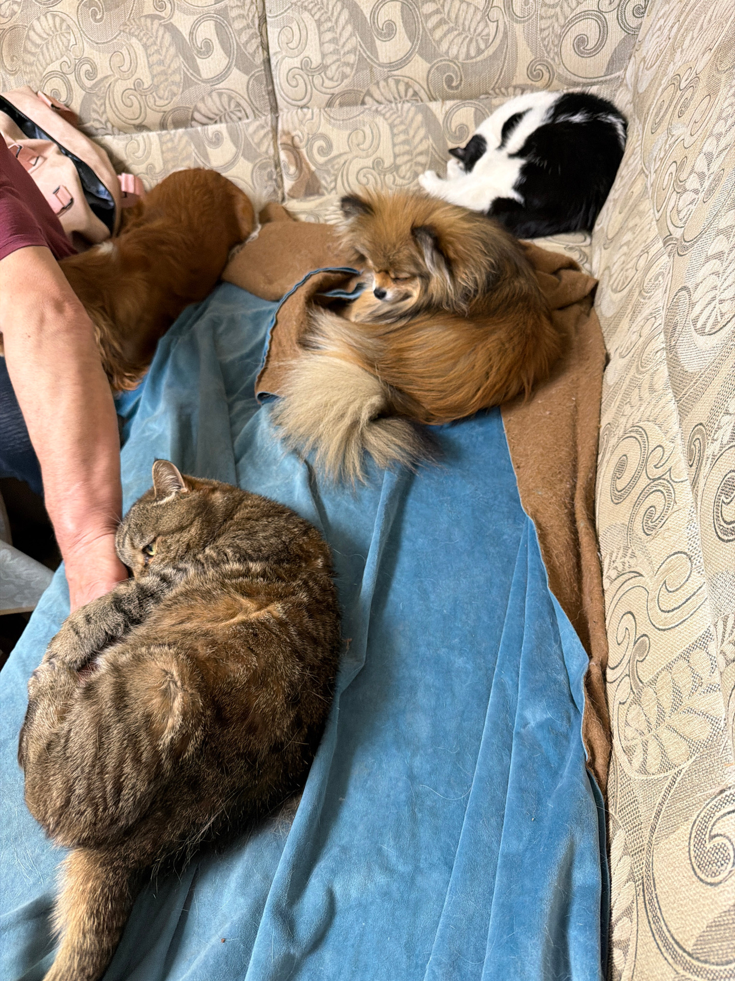 The scene depicts a tan and patterned sofa where a person, a black and white cat, a brown and tan Pomeranian dog, and a brown tabby cat are present. The cats and dog are resting or sleeping on a blue…read more