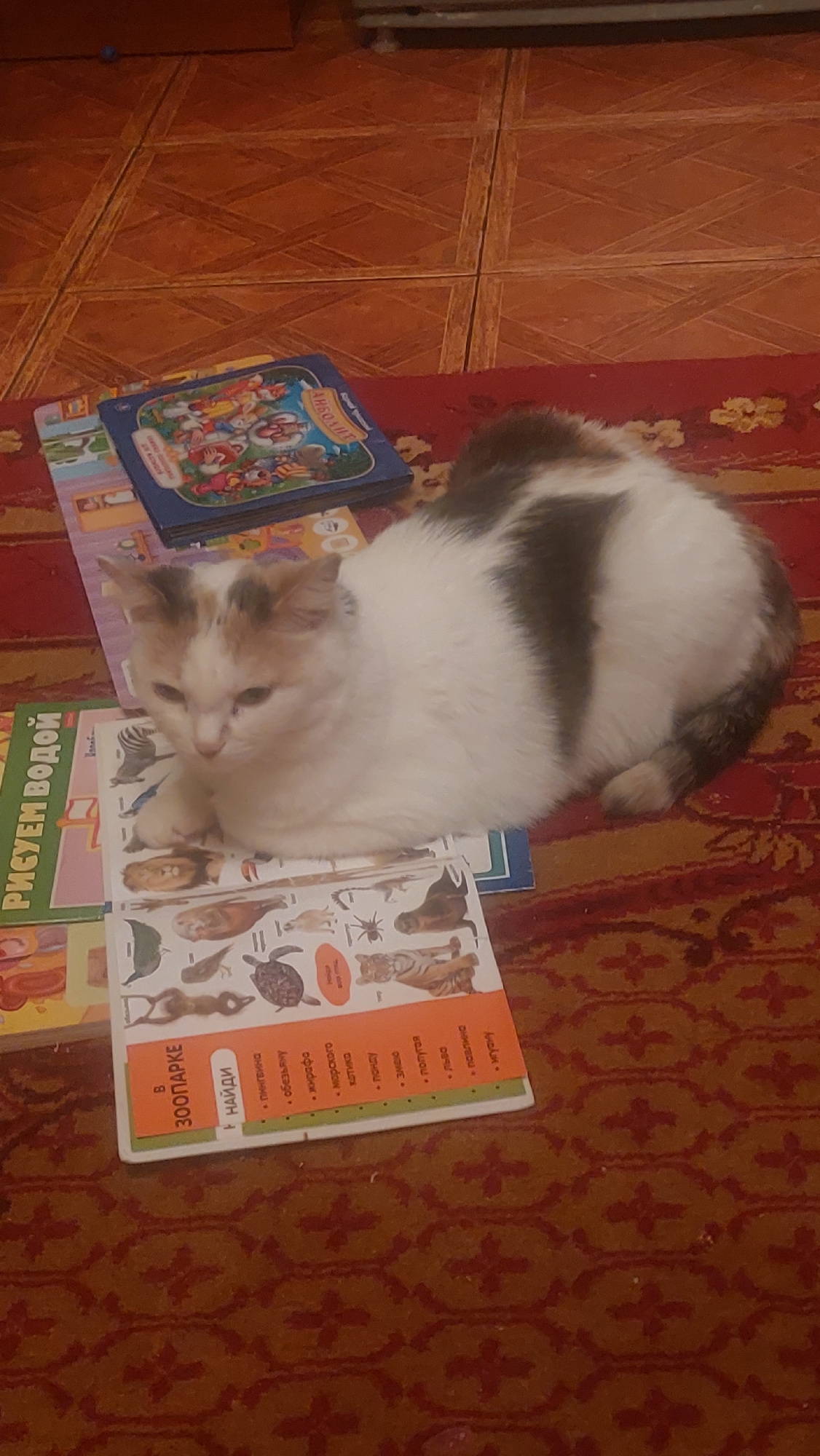 A top-down, slightly rotated view shows a white and gray cat lying on top of several children's books on a patterned rug, possibly inside a residence. The books include titles in Russian, one of whichβ¦read more