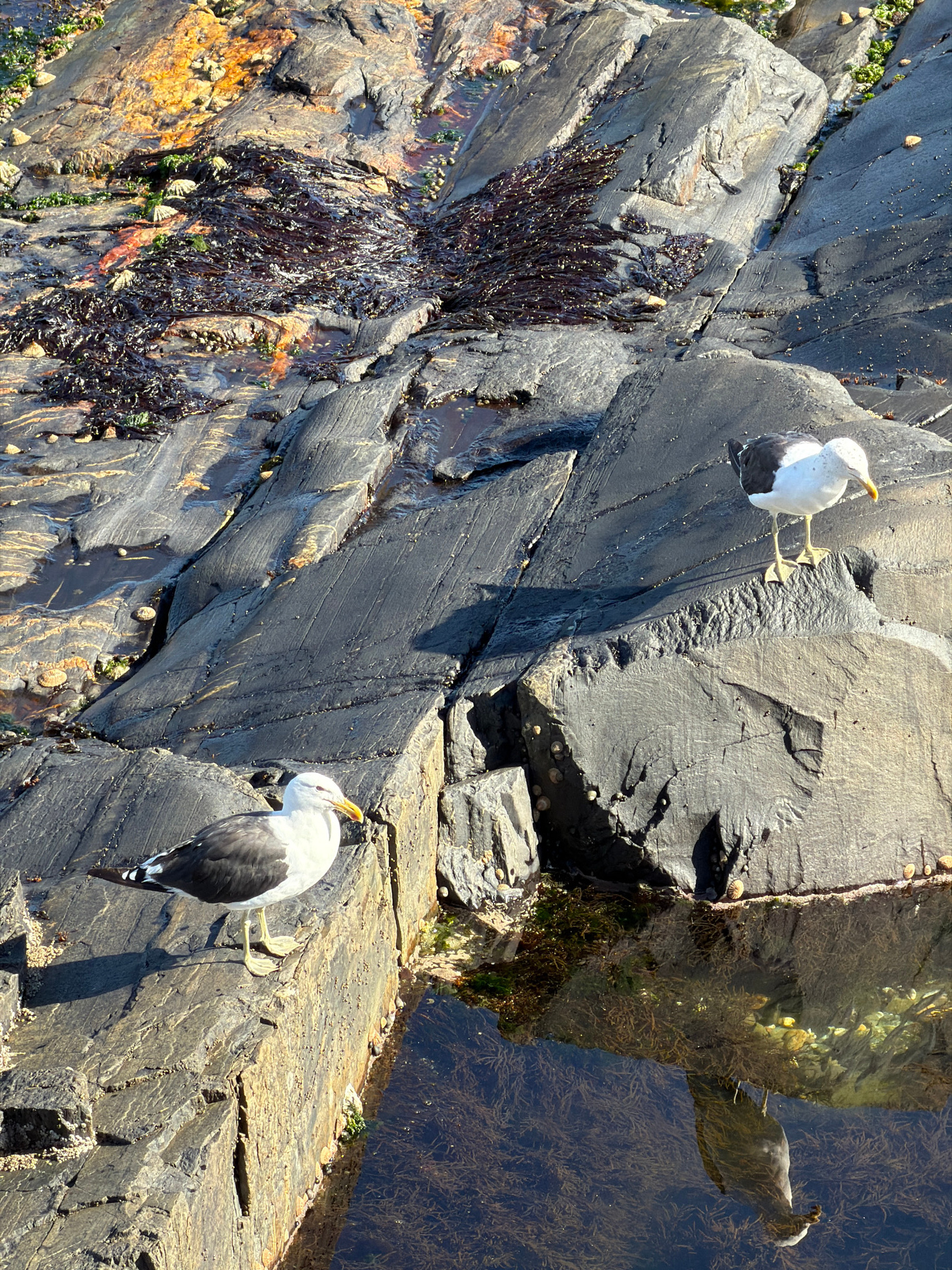The image shows a rocky coastal scene, potentially in Cape Town, South Africa, judging by the coastal terrain. Two seagulls are on the rocks. One is standing and facing left. The other is further away…read more