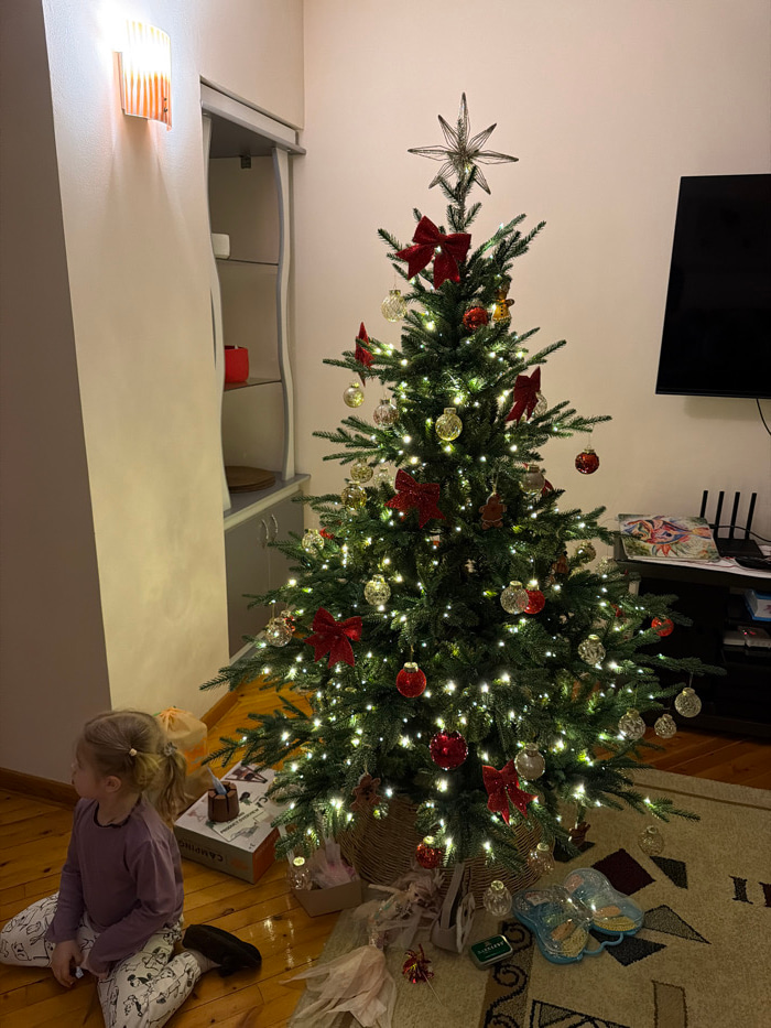 The image displays an indoor scene, identified as being in Tashkent, Uzbekistan, featuring a decorated Christmas tree and a young child. A synthetic evergreen Christmas tree stands prominently in theβ¦read more