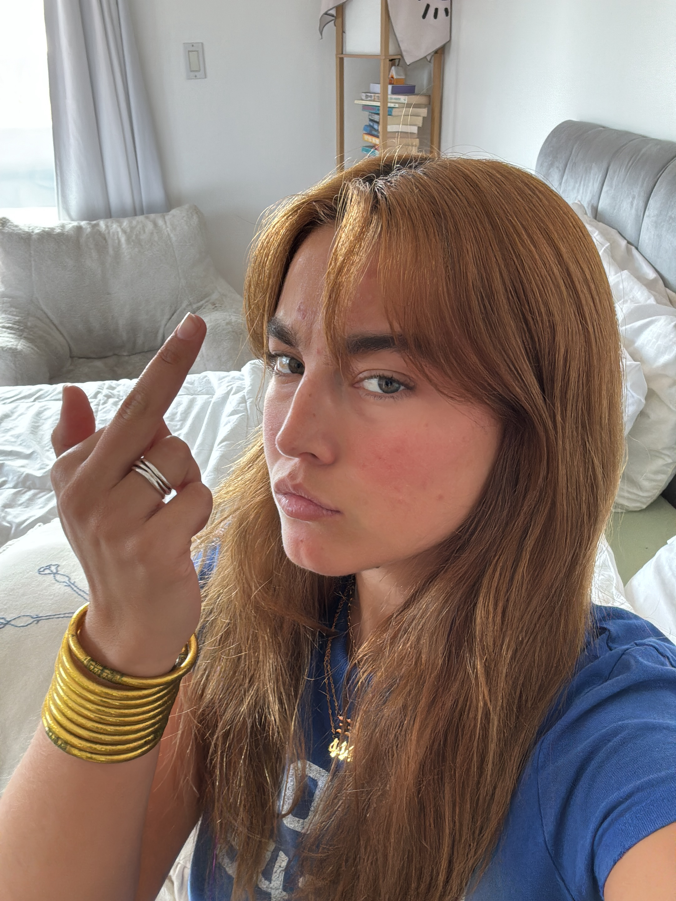 A young woman is captured in a medium close-up, directly facing the camera and raising her left middle finger in a defiant gesture. She has long, reddish-brown hair with bangs that frame her face, and…read more