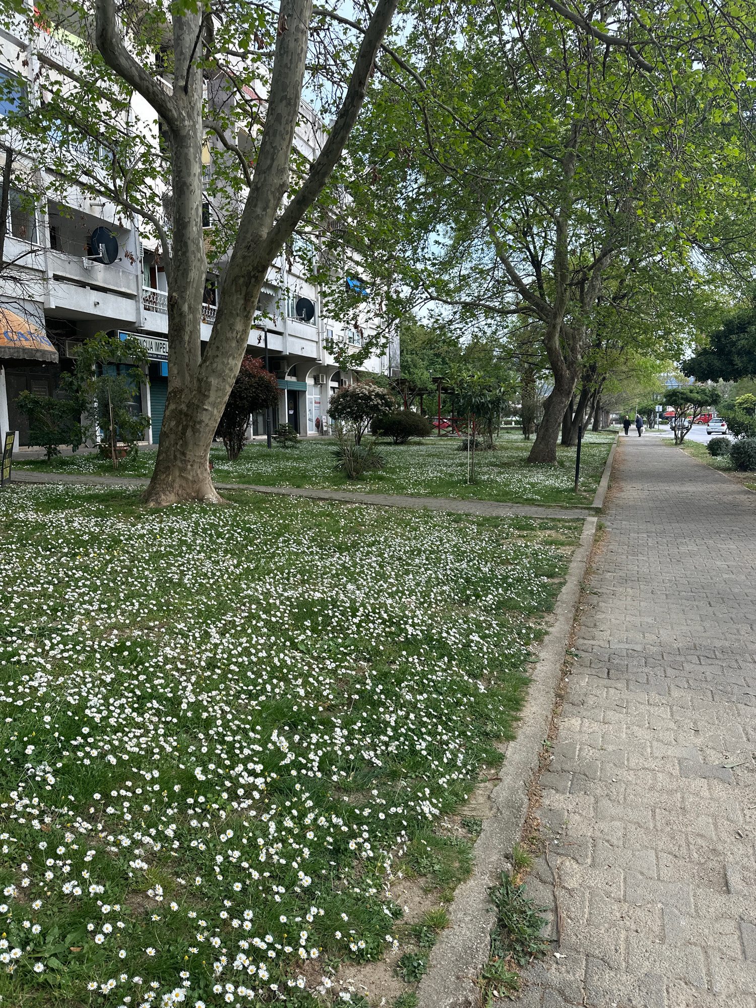 This image captures an urban green space in Bar, Montenegro, on what appears to be a bright, possibly overcast, daytime. The scene is dominated by a long, paved pedestrian walkway made of grey interlo…read more