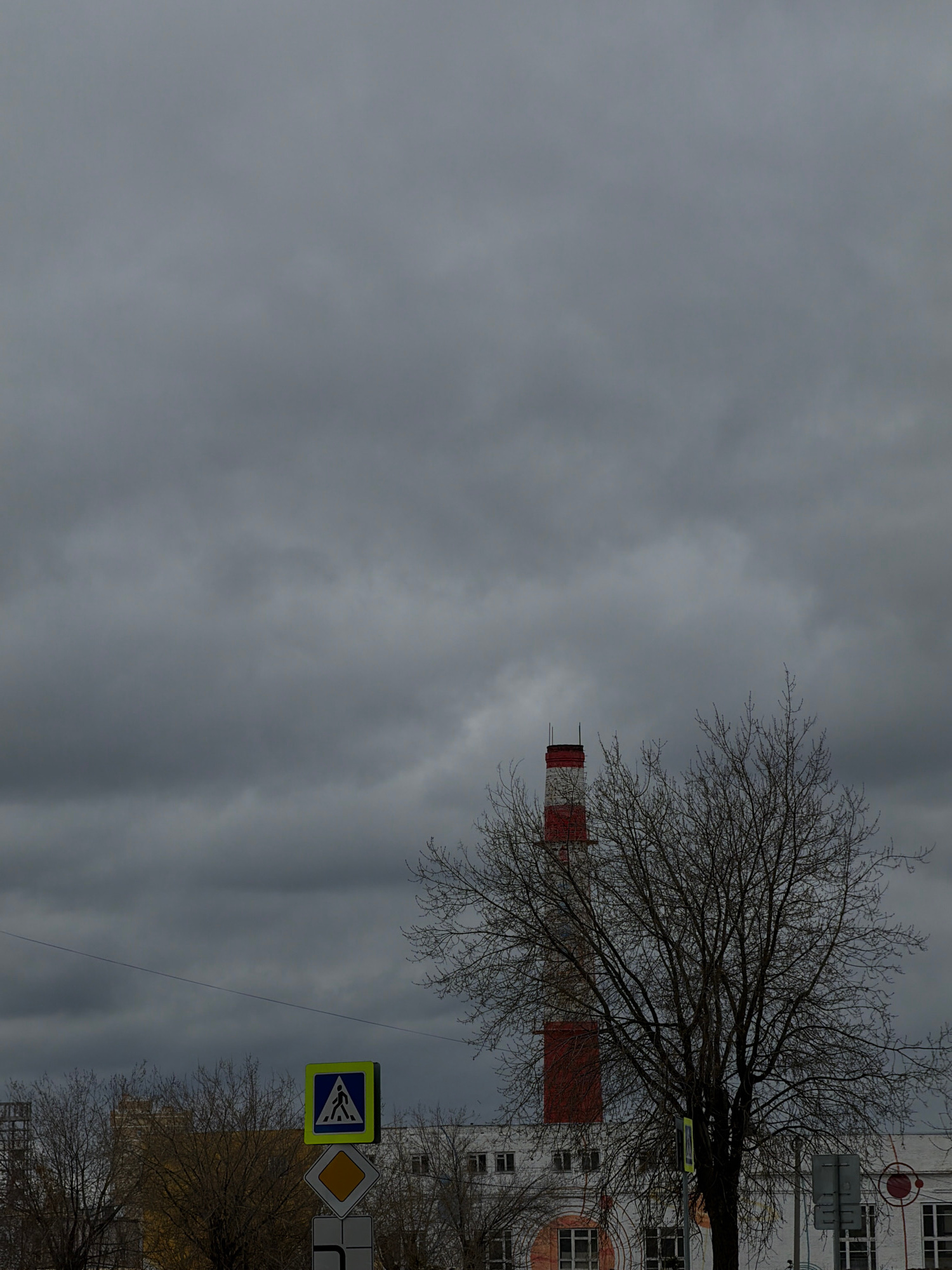 The image shows a street scene in Perm, Russia on an overcast day. A tall, striped chimney stands out against the gray sky. A bare tree obscures a white building. Road signs are visible, including a p…read more