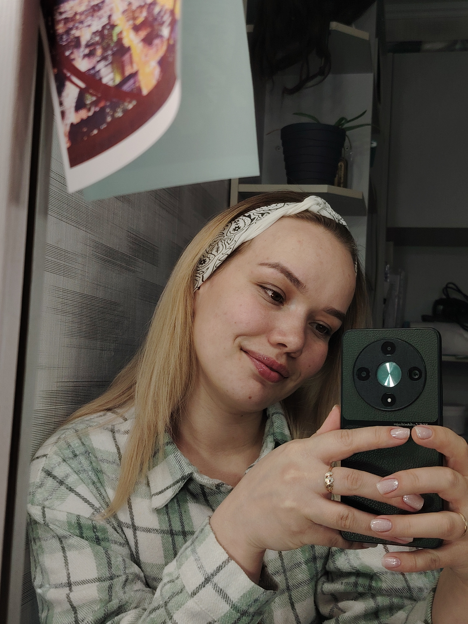 A young woman with light blonde hair, pulled back by a white patterned headband, takes a selfie indoors. She wears a light green and white plaid flannel shirt and smiles softly towards the camera of h…read more