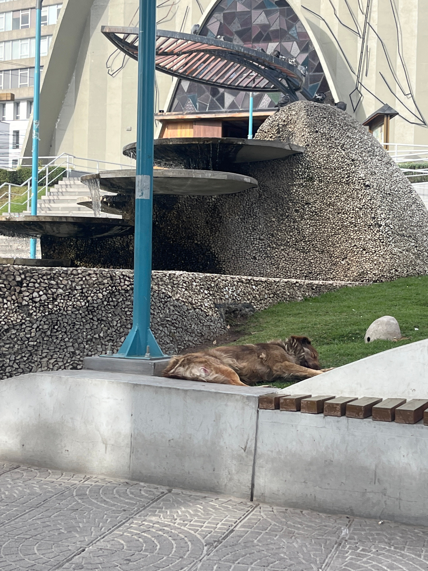The image depicts an outdoor public space in La Paz, Bolivia, featuring architectural elements, landscaping, and animals. The scene is brightly lit, suggesting daytime with clear weather. In the fore…read more