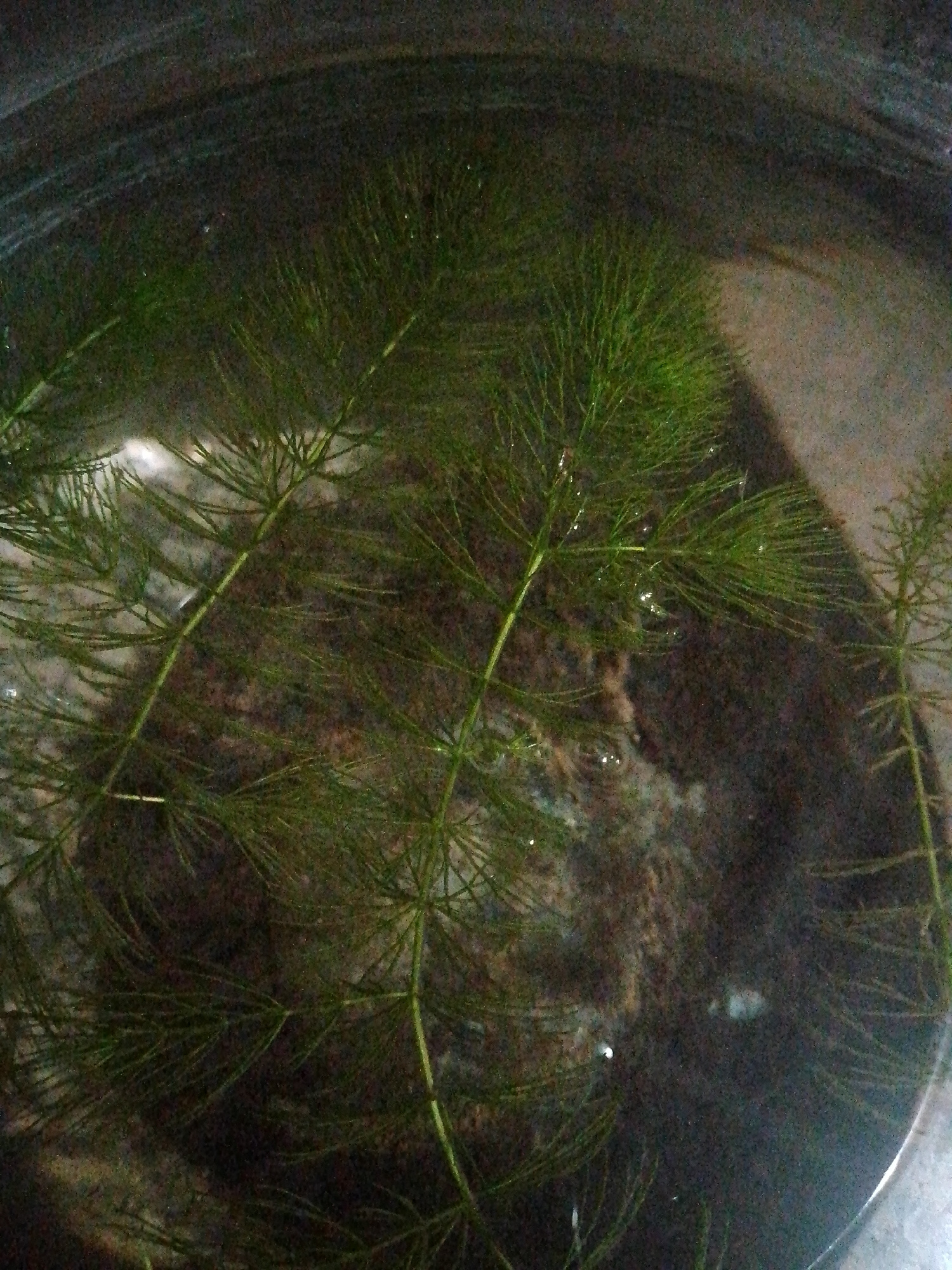 A top-down view inside a metallic container filled with water. Several green aquatic plants, appearing like *Ceratophyllum demersum*, are submerged within the water, positioned atop a dark, mottled su…read more