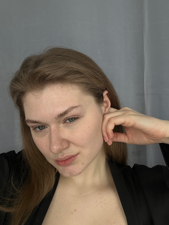 A fair-skinned woman with light brown hair poses in a sideways portrait. Her left hand is raised near her ear, fingers curled slightly. She has blue eyes and light eyebrows, with freckles visible on h…read more