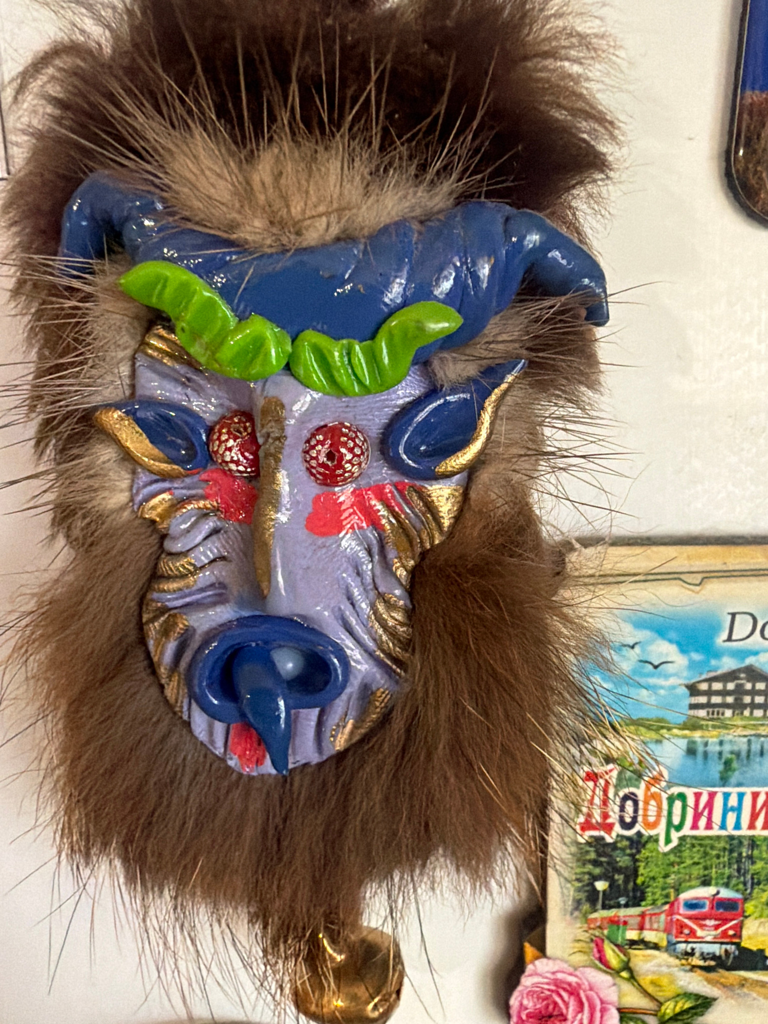 A vibrant, handcrafted decorative object, possibly a mask or creature figurine, is prominently displayed against a backdrop of soft, dark brown fur. The central sculpted piece features a textured, lig…read more