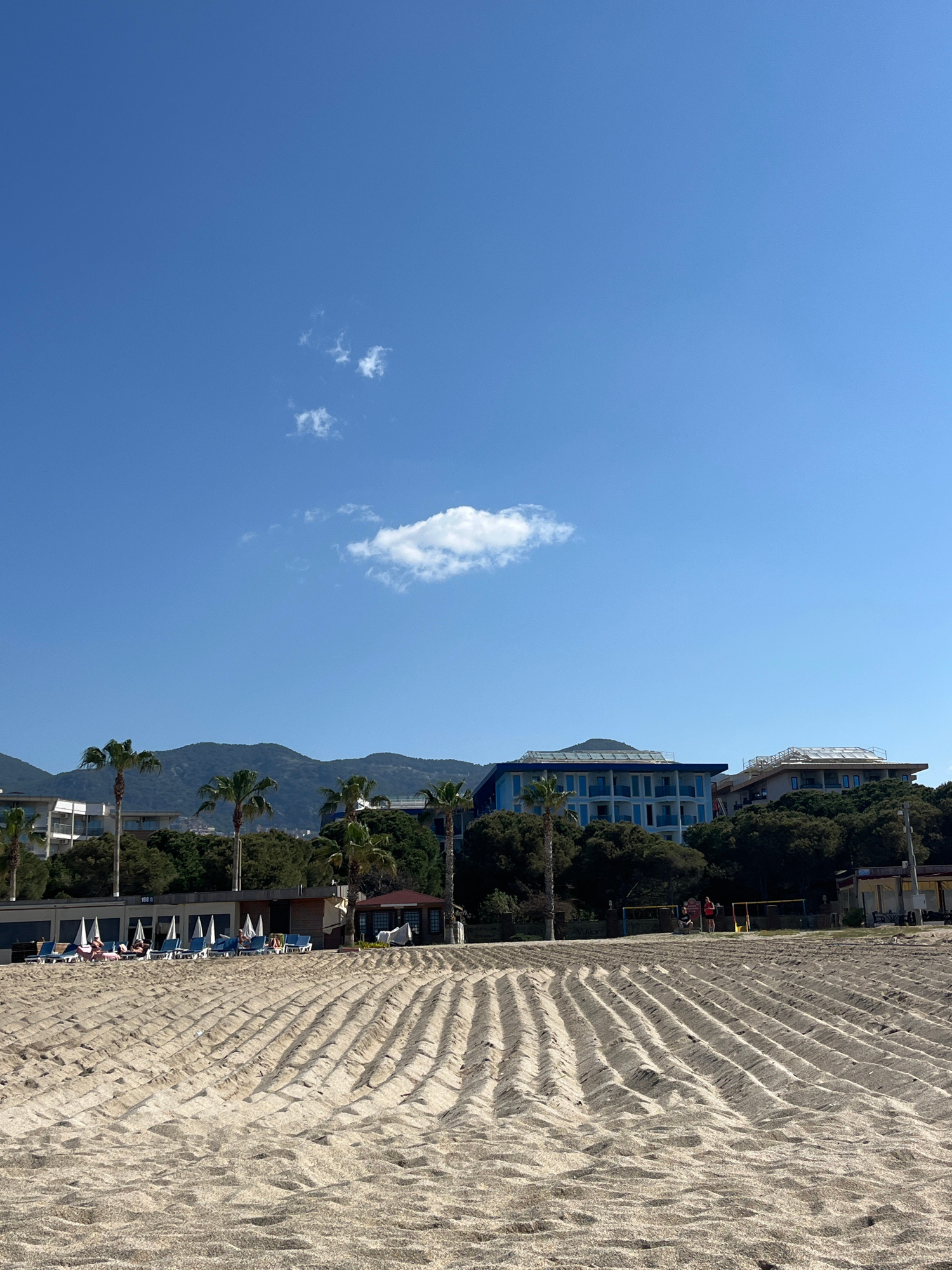 The image depicts a beach scene in Alanya, Turkey. The composition features a clear, blue sky with a small cloud on the left, transitioning to a shoreline with a sandy beach on the right. Palm trees a…read more