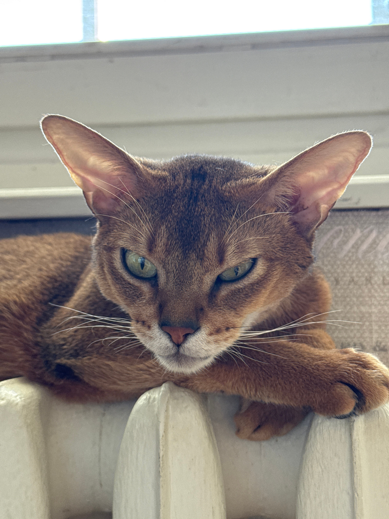 An Abyssinian cat clings to a white radiator. The cat has tawny fur, green eyes, and long white whiskers. The cat's left ear is illuminated by natural light from a nearby window. The radiator appears…read more