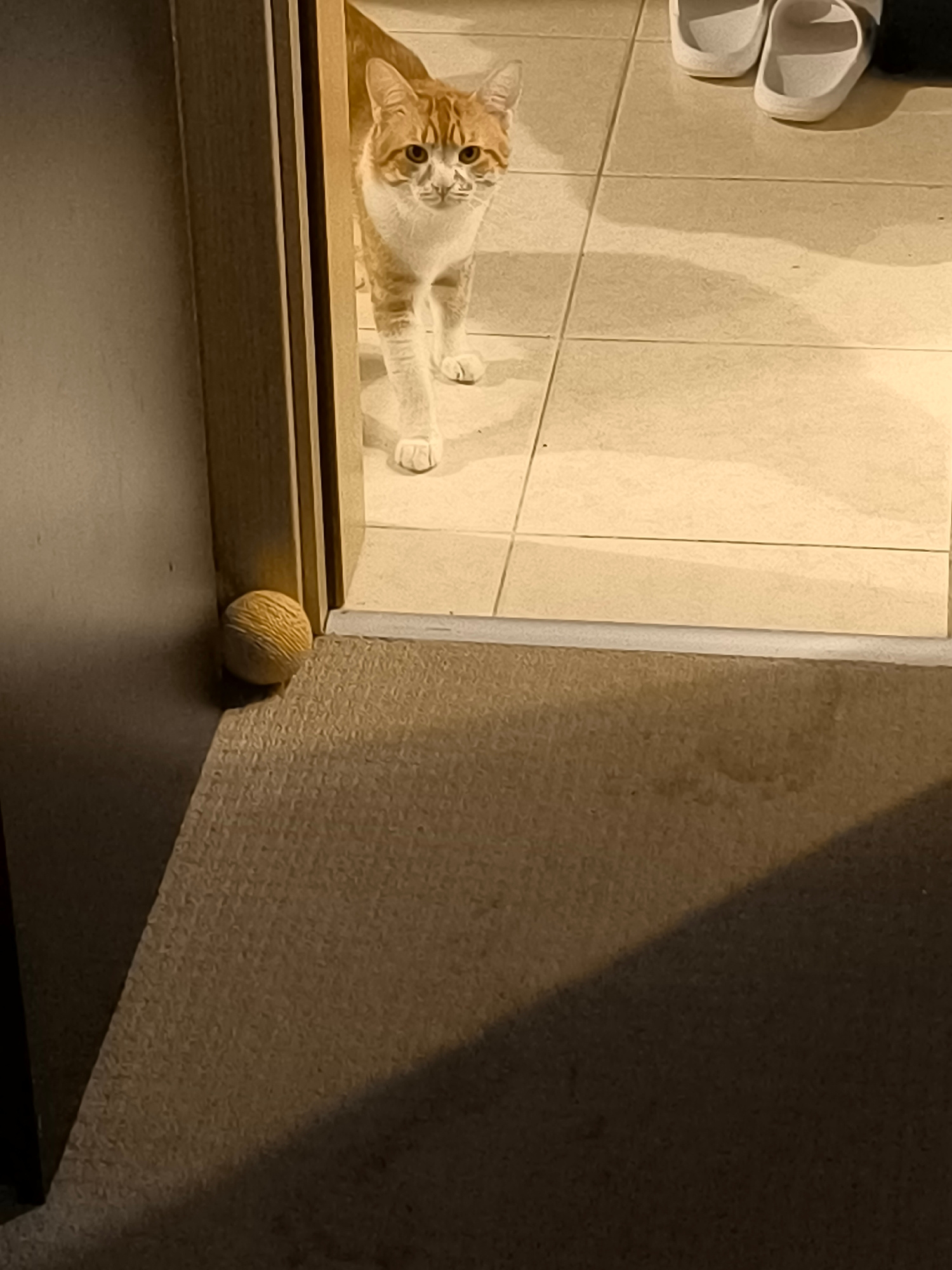 An indoor scene is visible, featuring a light orange and white cat standing in the doorway. The cat appears to be looking directly at the camera. Behind the cat is a tiled floor. Two white sandals are…read more