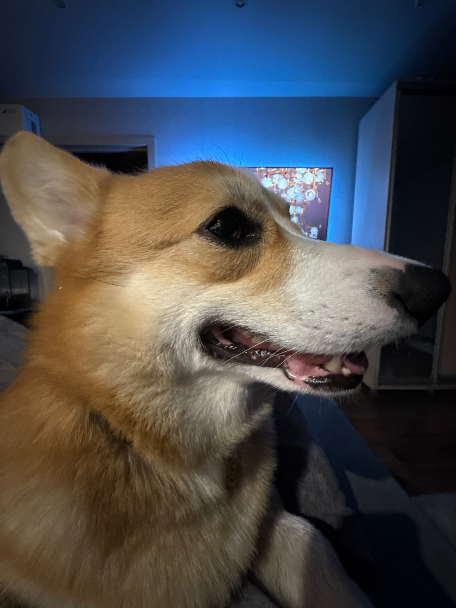 A close-up, low-angle shot of a corgi dog is captured indoors. The dog is angled upward and slightly toward the left, with its mouth open, revealing its teeth and tongue. The corgi's fur is a mix of t…read more