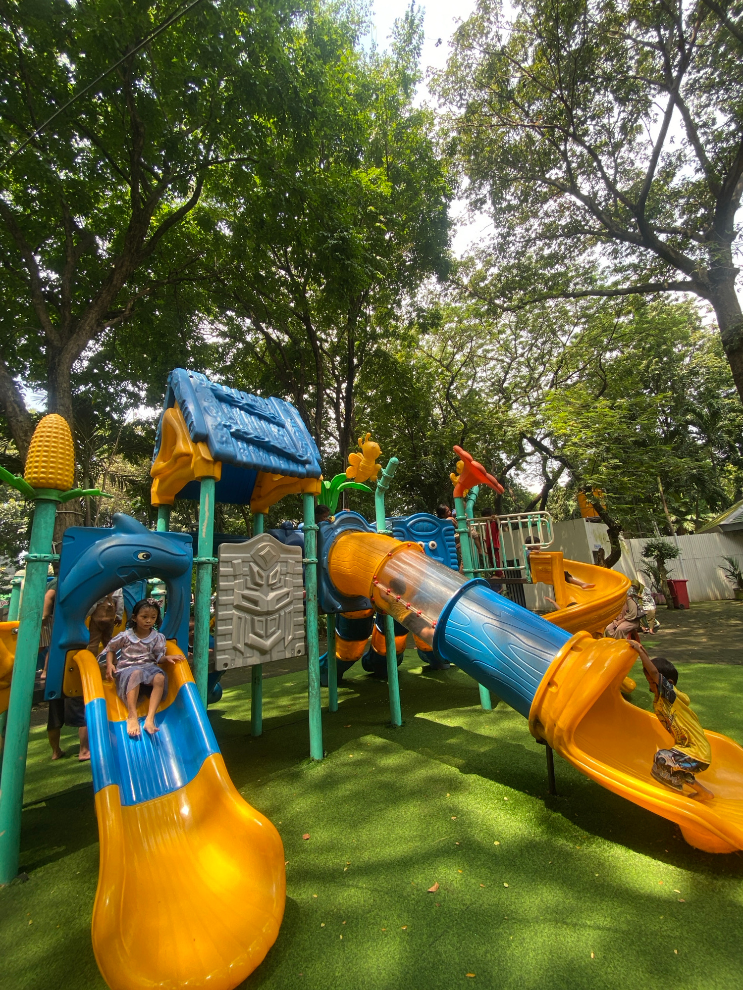 This image captures a lively children's playground scene in Surabaya, Indonesia, under bright daylight. The central focus is a multi-colored playground structure featuring various slides and climbing…read more