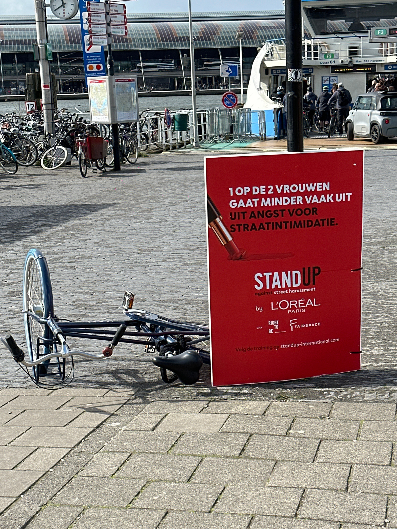 The image shows a street scene in Amsterdam, Netherlands. A red sign for "STAND UP against street harassment" by L'Oréal Paris stands on the right. The sign states "1 op de 2 vrouwen gaat minder vaak…read more