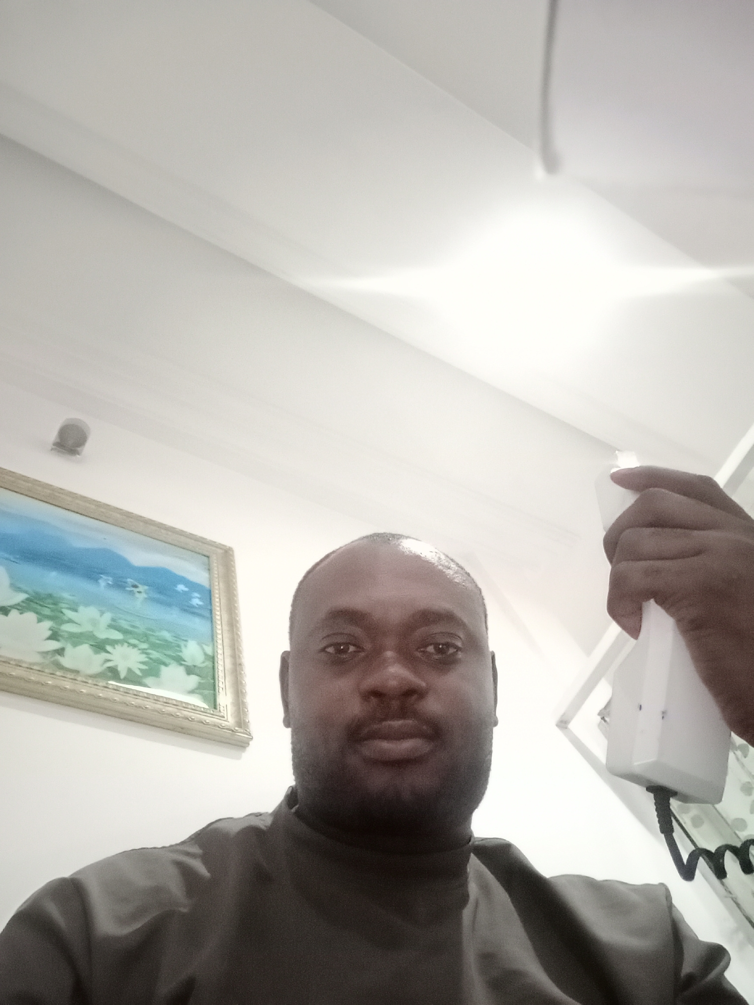 A dark-skinned man is holding a white landline telephone receiver near his right ear. He is facing the camera. He is wearing a dark collared shirt. Behind him is a white wall. There is a framed pictur…read more