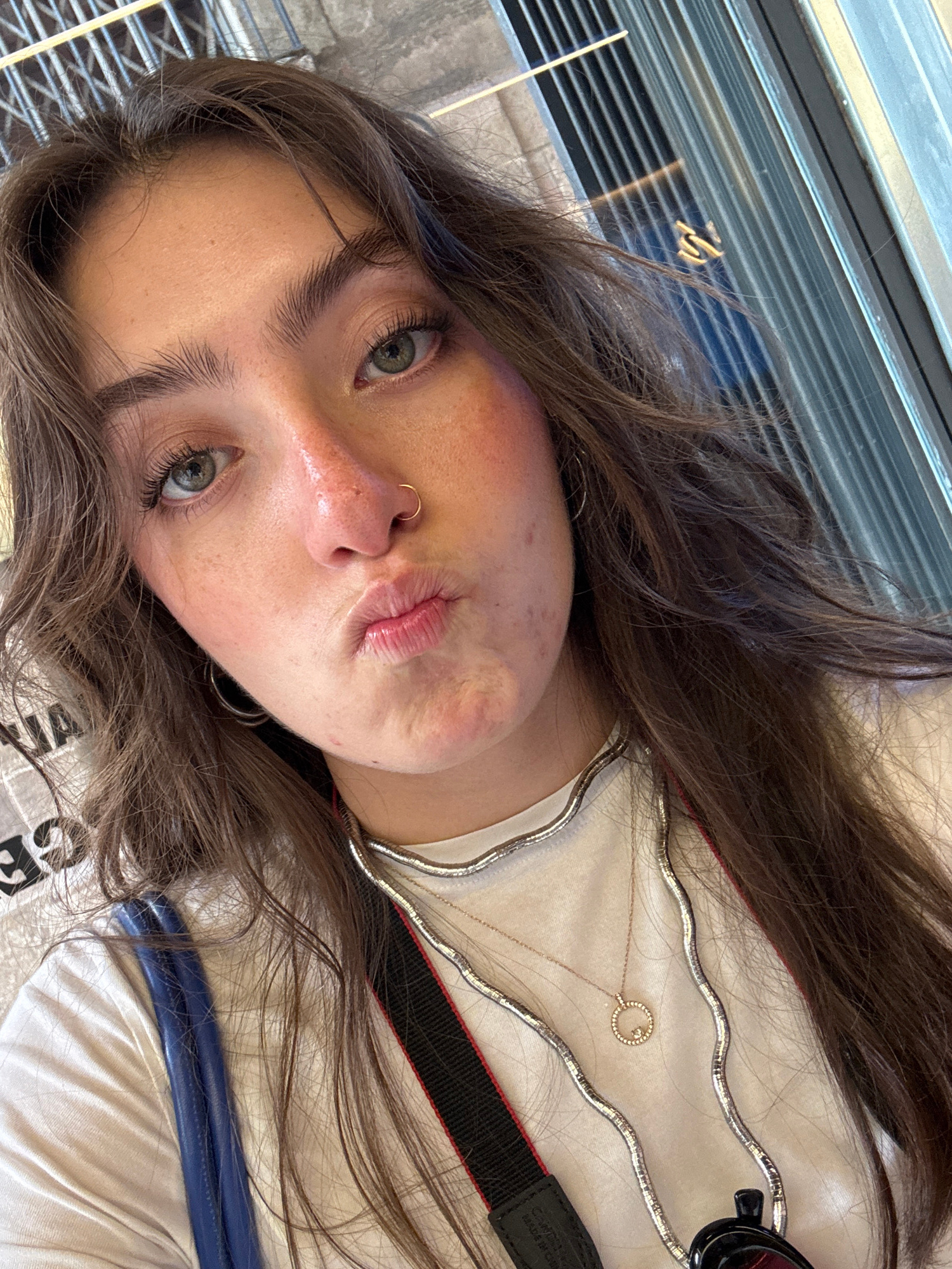 A young woman is seen from a low angle, looking at the camera with pursed lips. She has brown hair, fair skin with freckles, and is wearing a nose ring. She has on a white top with silver chain embell…read more