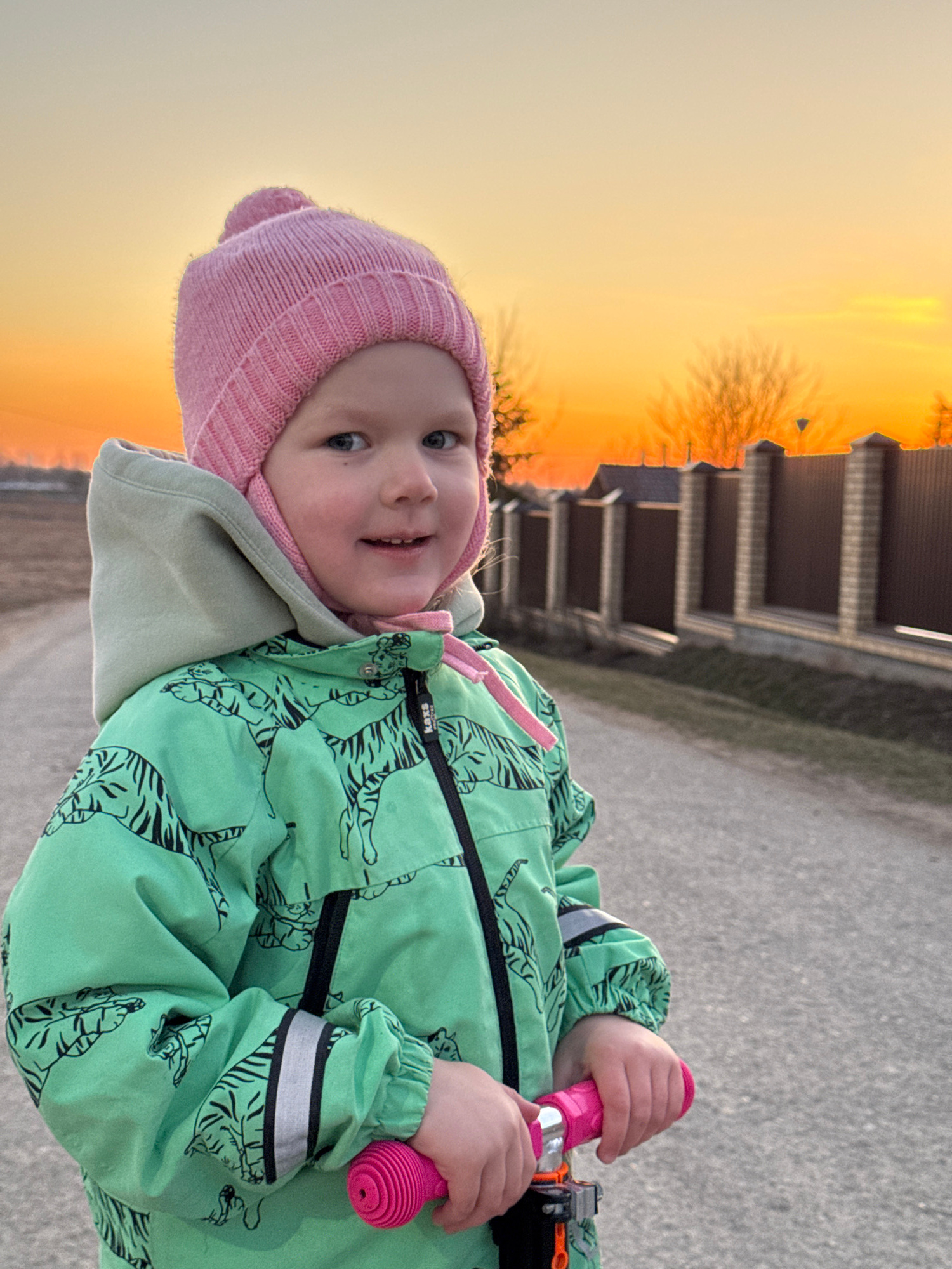 A young child with a pink knit cap and a green jacket patterned with black tigers is standing on an asphalt surface outdoors. The child is holding a pink object, potentially part of a scooter or toy. Behind the child is a building with horizontal architectural details, and above it, the sky is a gradient of orange and yellow, indicating sunrise or sunset. The photograph appears to have been taken in Горный, Russia, based on provided location context. | Open Wire