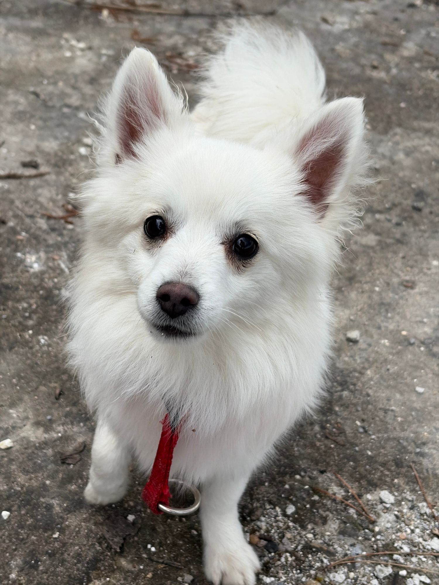 A white, small breed dog with fluffy fur is lying on a concrete surface. The dog has dark eyes and a black nose. It wears a red collar with a metal ring. The background is a gray concrete surface with…read more
