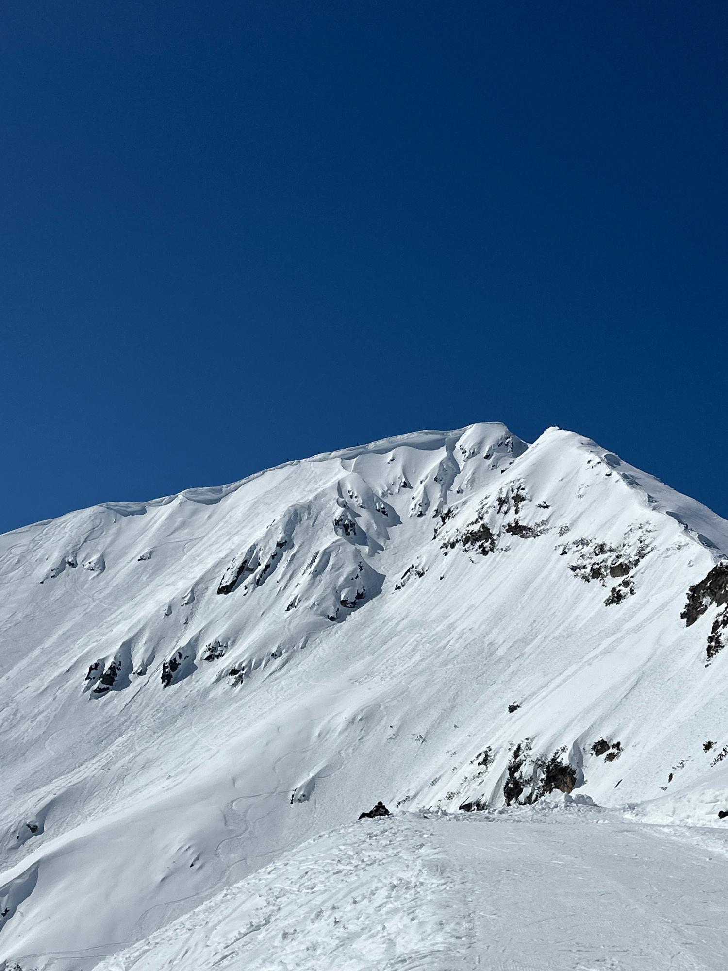 The image shows a steep, snow-covered mountain slope against a clear, deep blue sky. The mountain appears to be rocky with patches of exposed dark rock interspersed within the snow. There are visible…read more