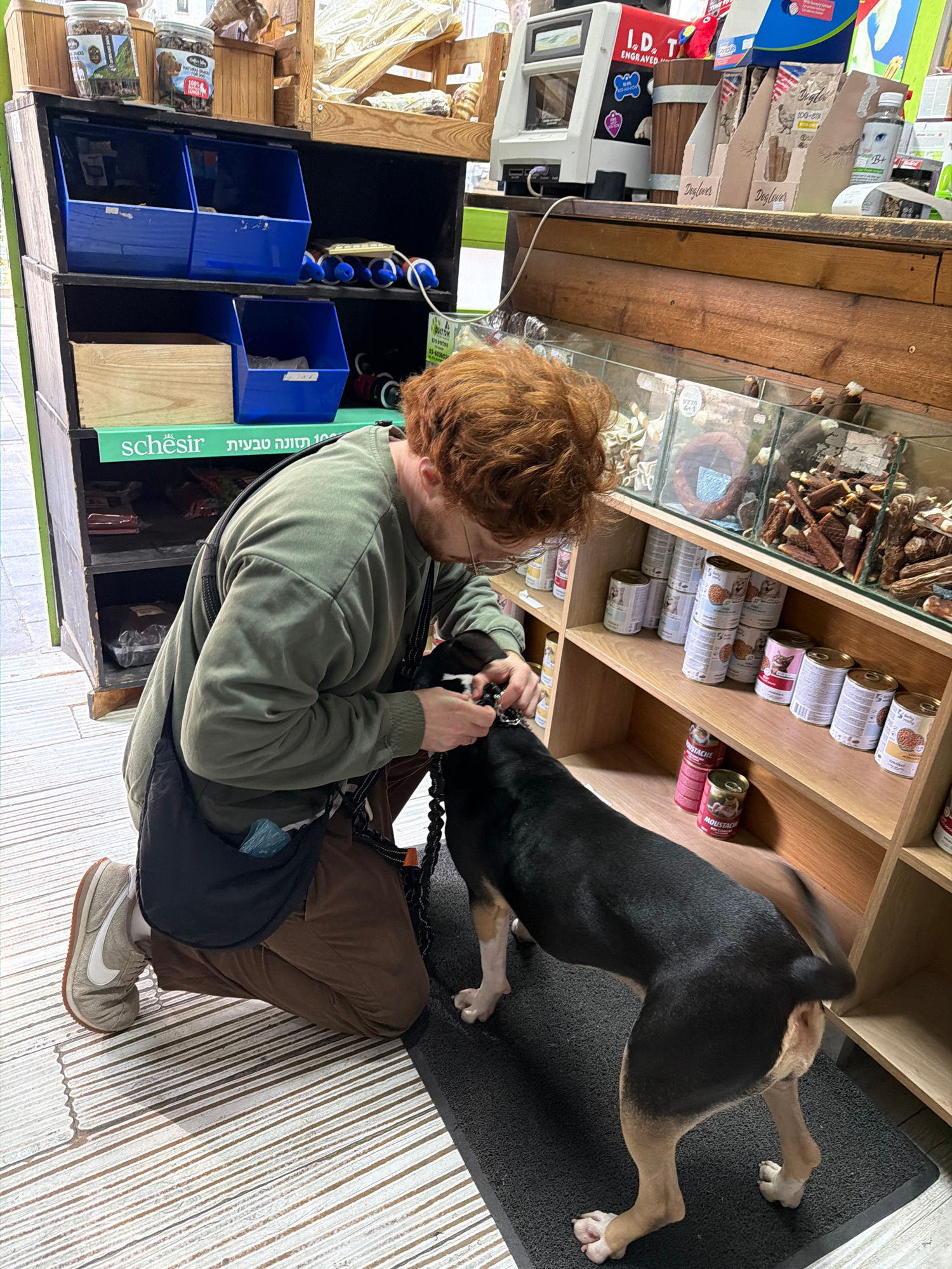 A medium-shot captures a person with ginger hair, wearing a green sweater and brown pants, crouched down while attaching a leash to a black and tan dog in what appears to be a pet store. The store has…read more