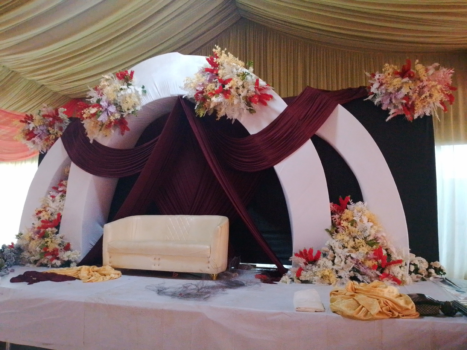 The image shows a wedding reception stage in Bukuru, Nigeria. The stage is decorated with three white arches, draped with maroon fabric and adorned with floral arrangements in shades of white, red, anβ¦read more