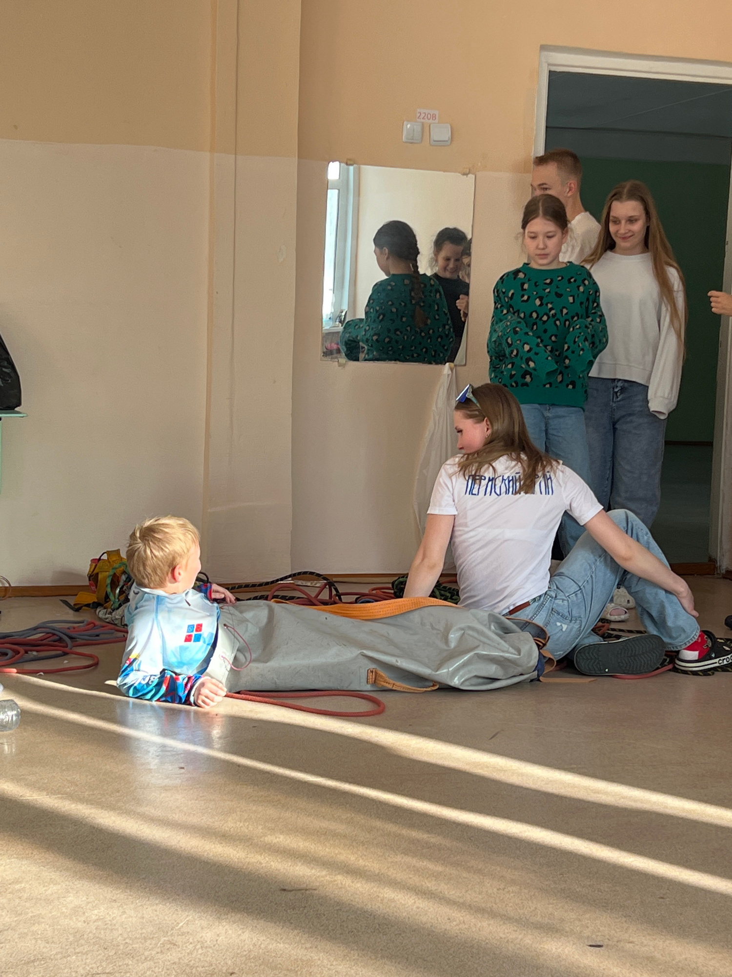 The image shows a group of four people standing in a room, with a child lying on the floor at their feet. The location is Berezniki, Russia, as indicated by the text on the woman's shirt. From top to…read more
