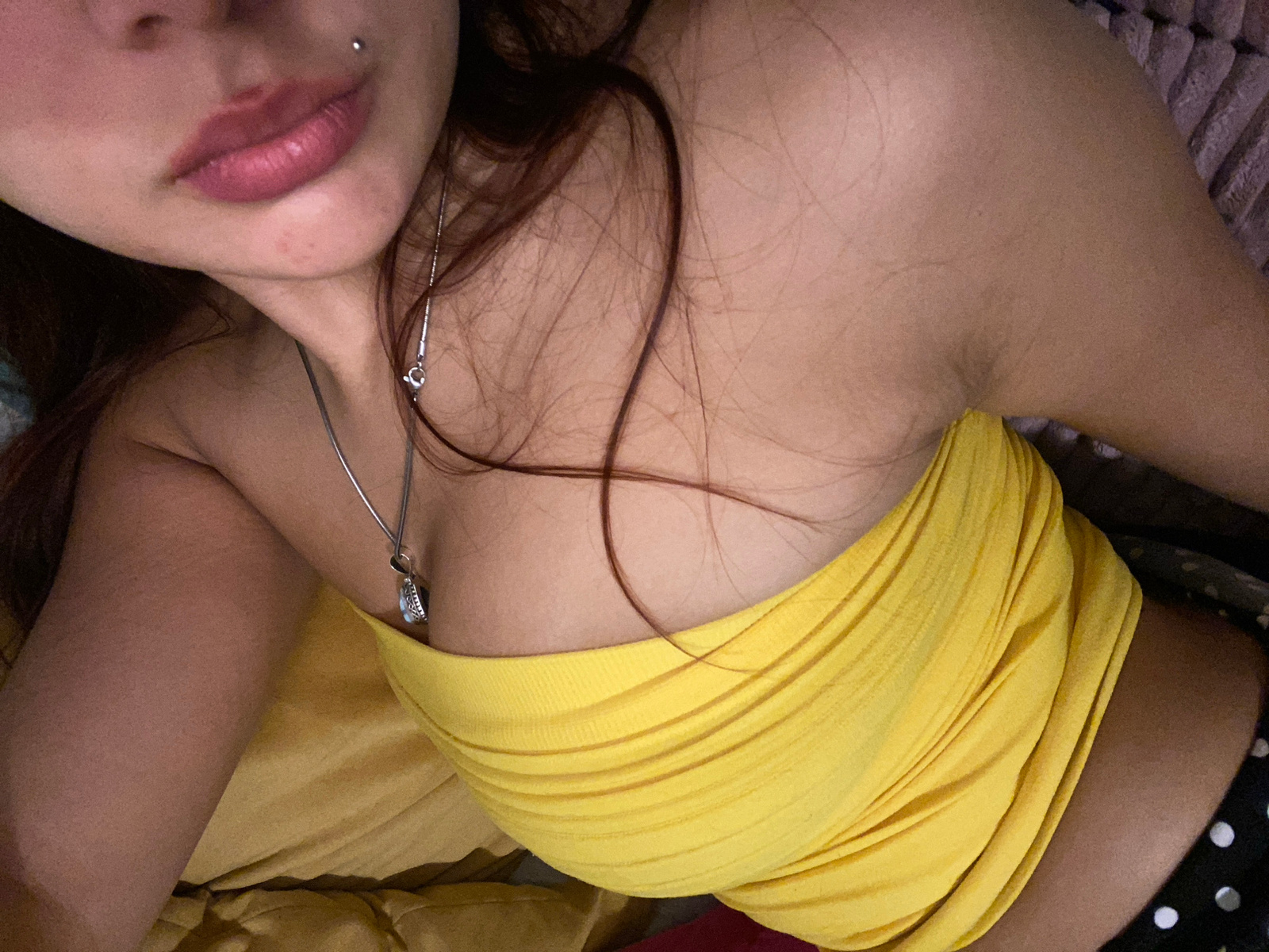 This close-up, upward-angle photograph features a person, likely female, lying down in an indoor setting. The individual is positioned diagonally across the frame, showcasing their upper torso, head,…read more