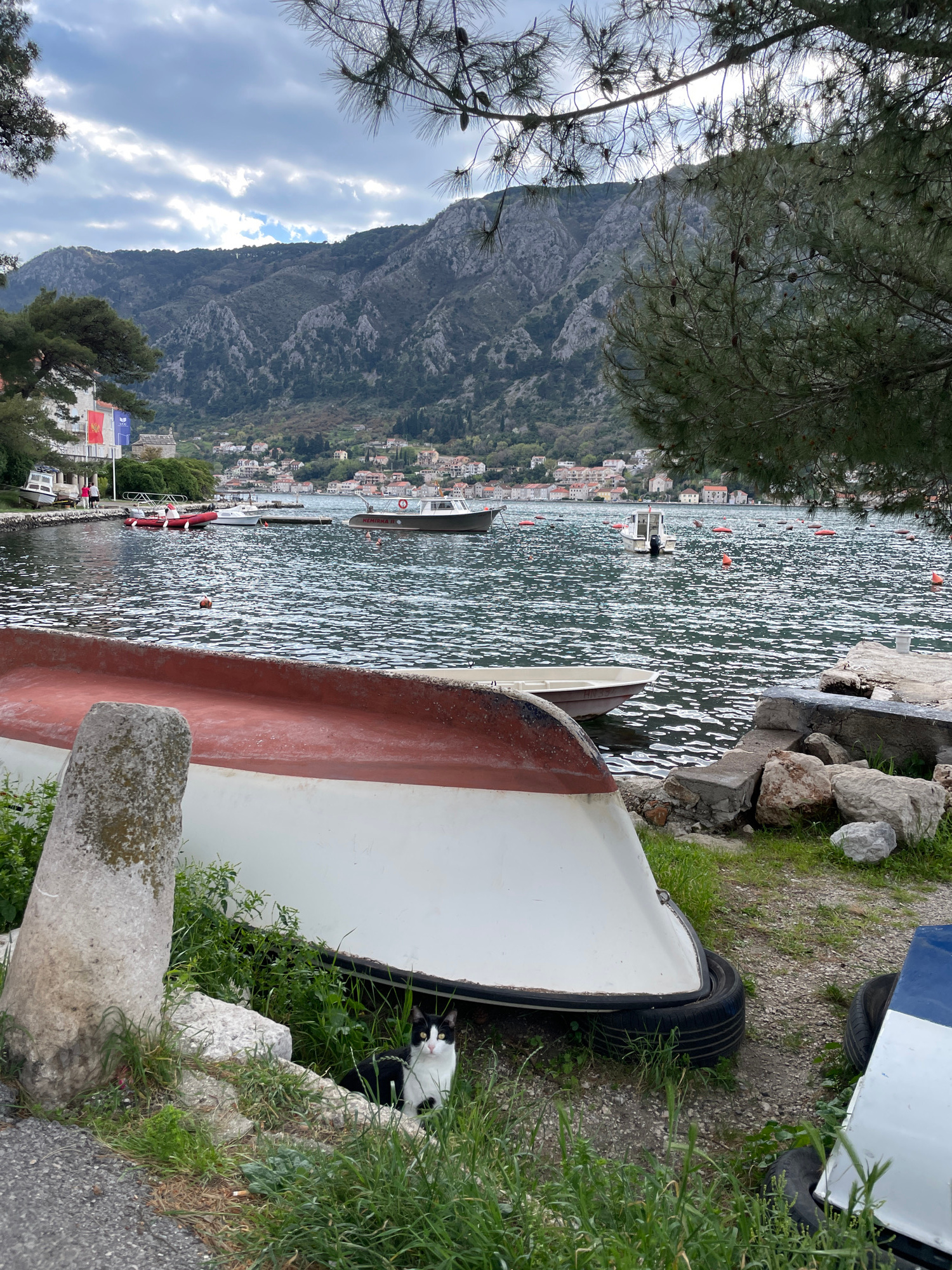 The image depicts a waterfront scene in Dobrota, Montenegro. A white and red-trimmed boat rests on the ground, adjacent to a paved path. Beside the boat, amidst the grass, is a black and white cat. Th…read more