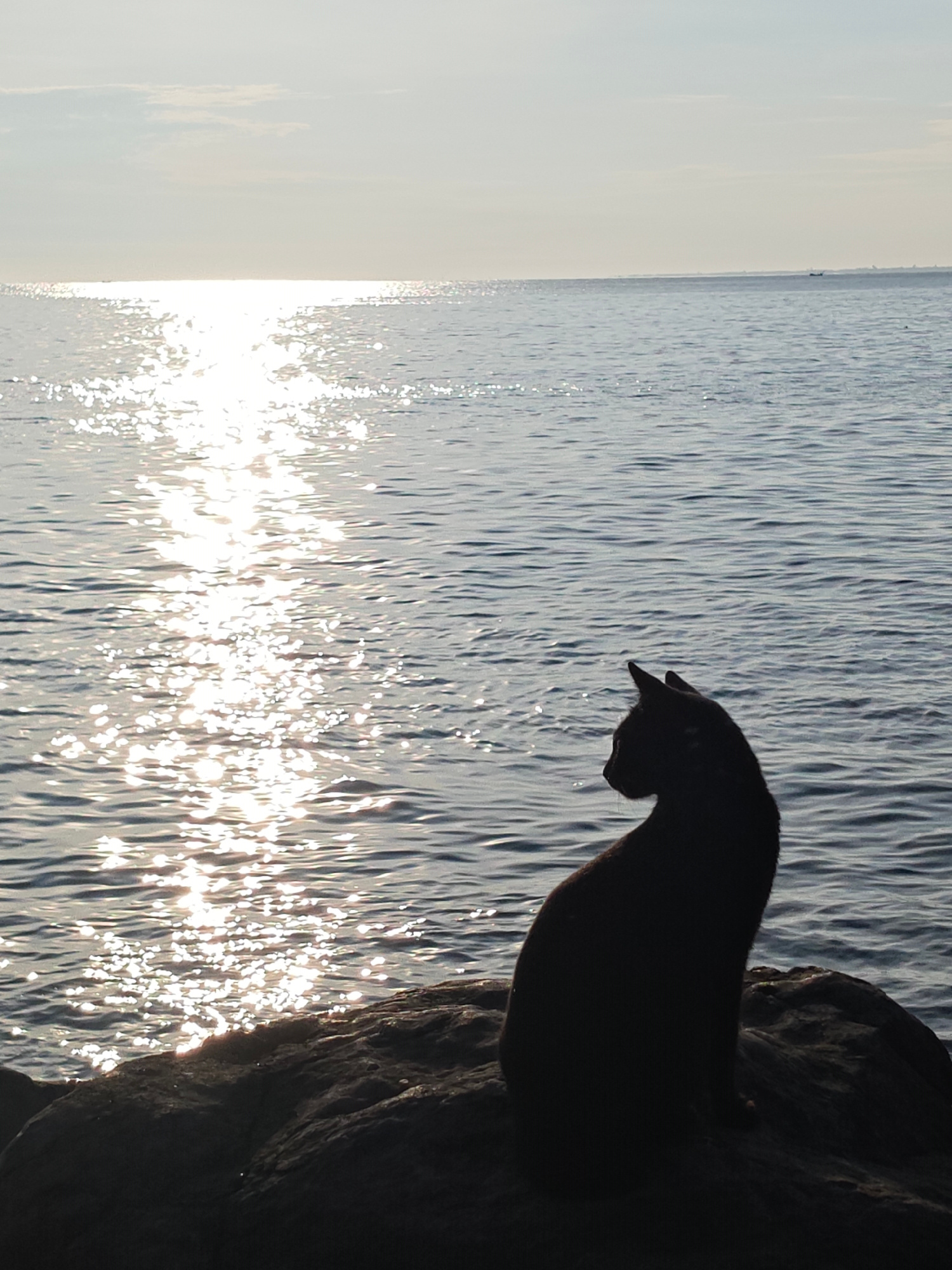 A silhouette of a black cat sits on a rock, facing the ocean. The ocean surface reflects sunlight. The sky is bright and clear. In the distance, a boat is visible. The location is Lhokseumawe, Indones…read more