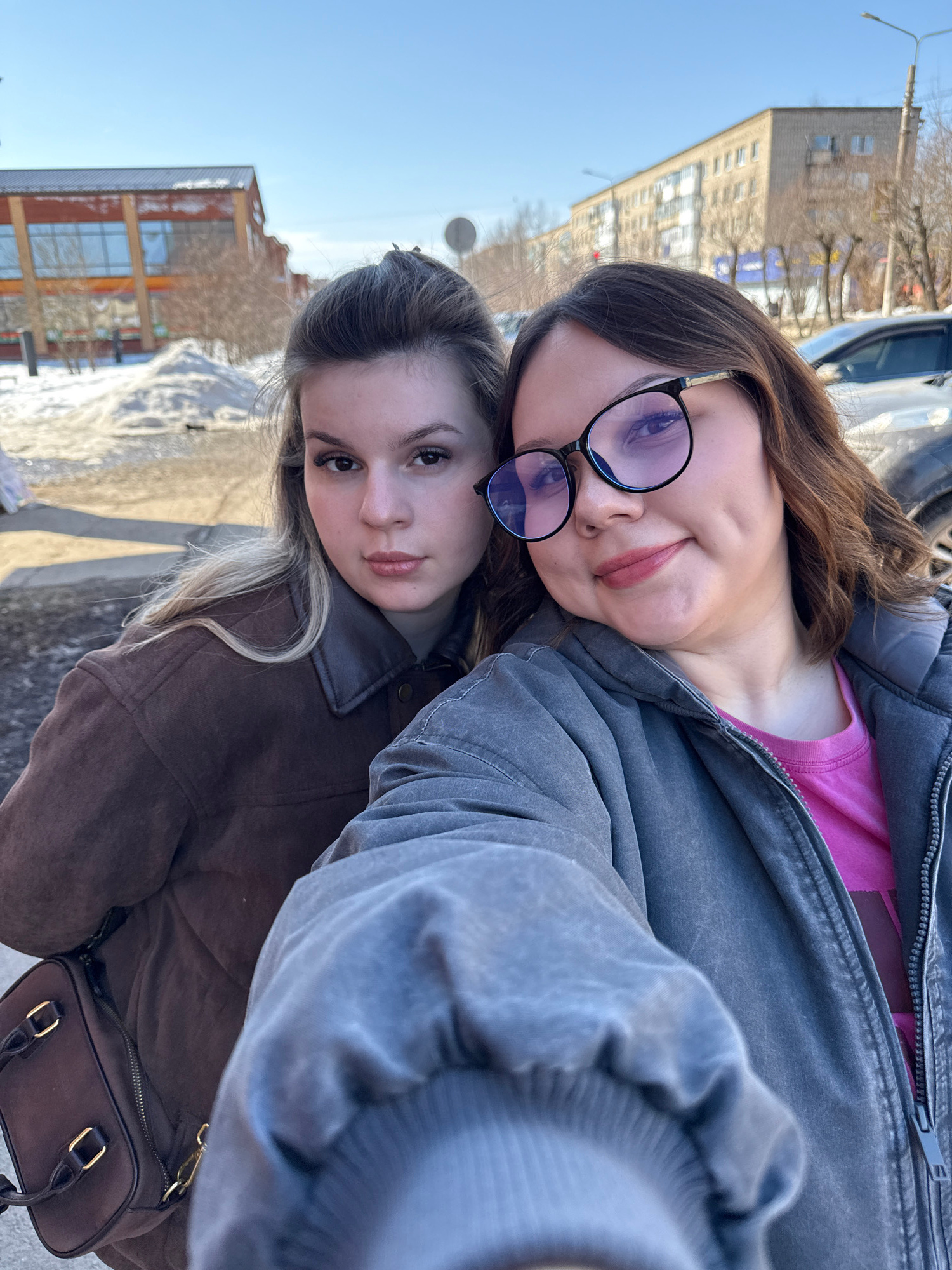 This is a daytime selfie photograph featuring two young adult women outdoors in Chernushka, Russia, during what appears to be late winter or early spring. The woman on the left has light brown hair,…read more
