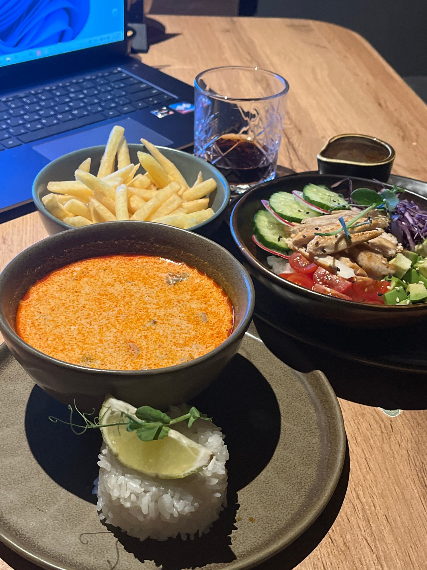 On a wooden table in Unknown, Unknown, a variety of dishes are arranged near a laptop and a glass of liquid. At the top, there is a dark bowl containing a salad with chicken, avocado, red cabbage, cuc…read more
