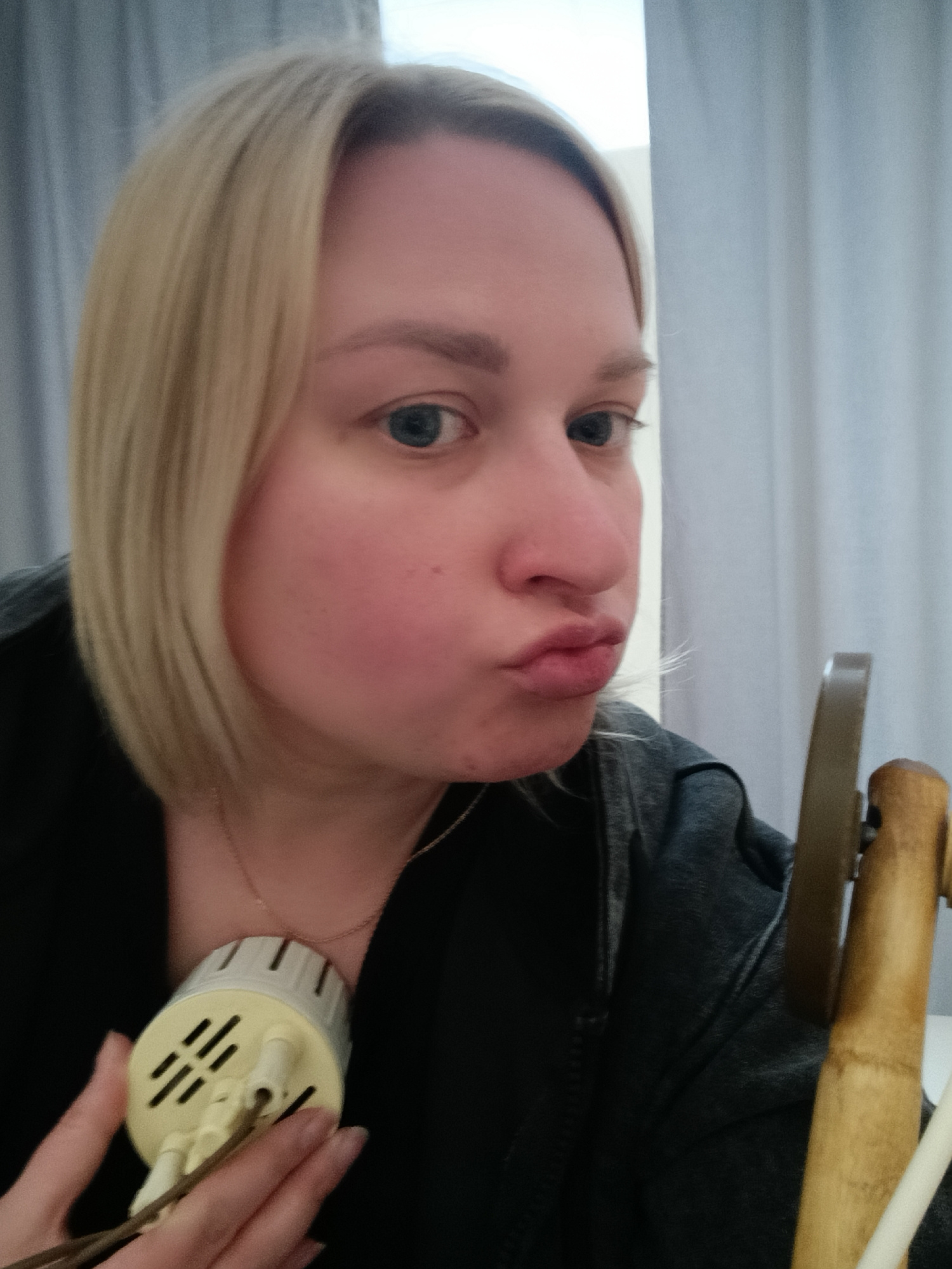 A fair-skinned woman with short blonde hair and blue eyes is holding a small, cylindrical, off-white electrical device with slots and prongs in her left hand near her chest. She is wearing a black jac…read more